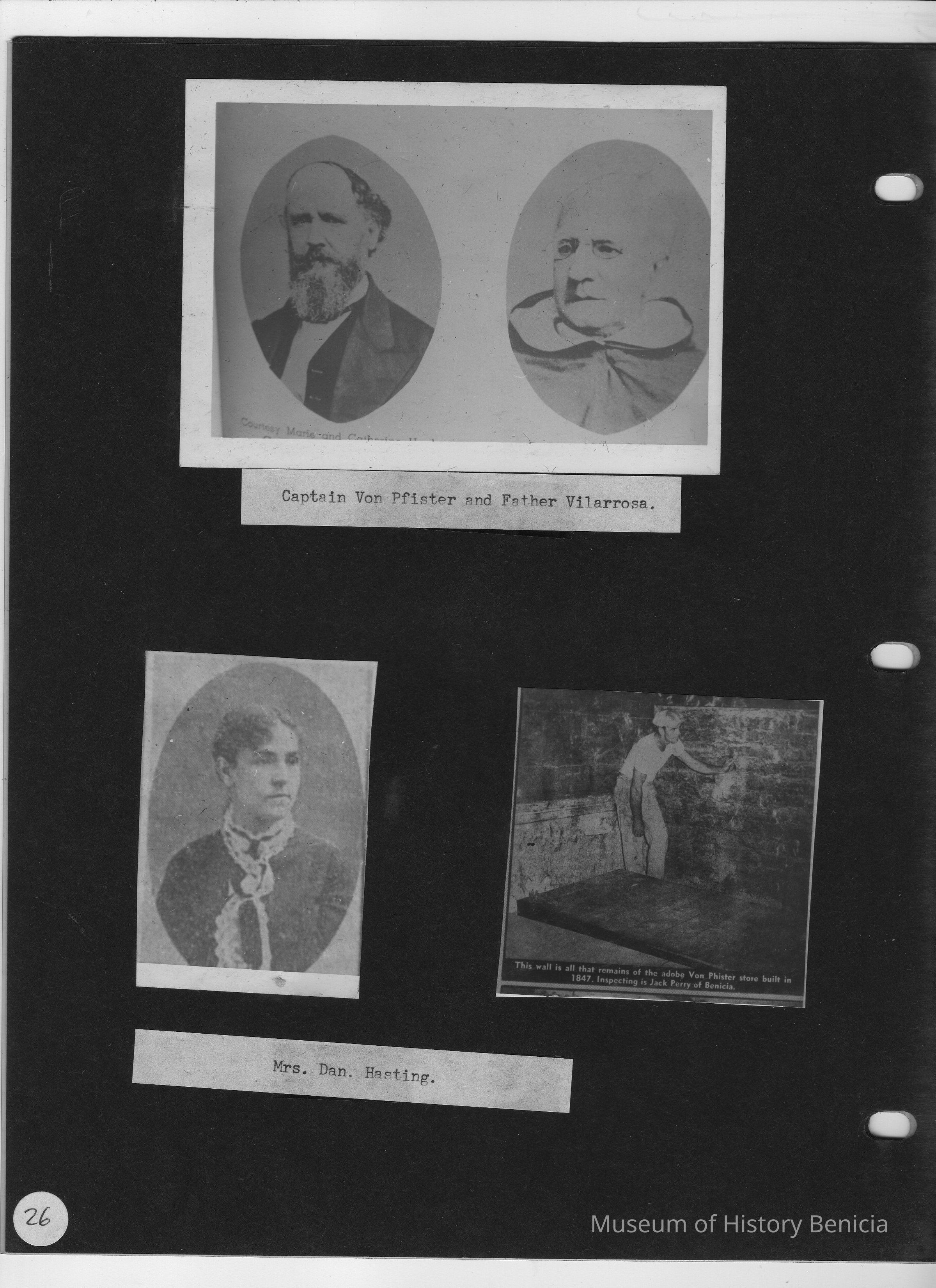 Page contains three B/W photos. Top photo is a double portrait; left side shows Captain von Pfister, right side shows Father Vilarrasa. Bottom left photo is a portrait of Mrs. Daniel Hastings. Bottom right photo shows Jack Perry inspecting the adobe wall of the Von Pfister Store.Collection