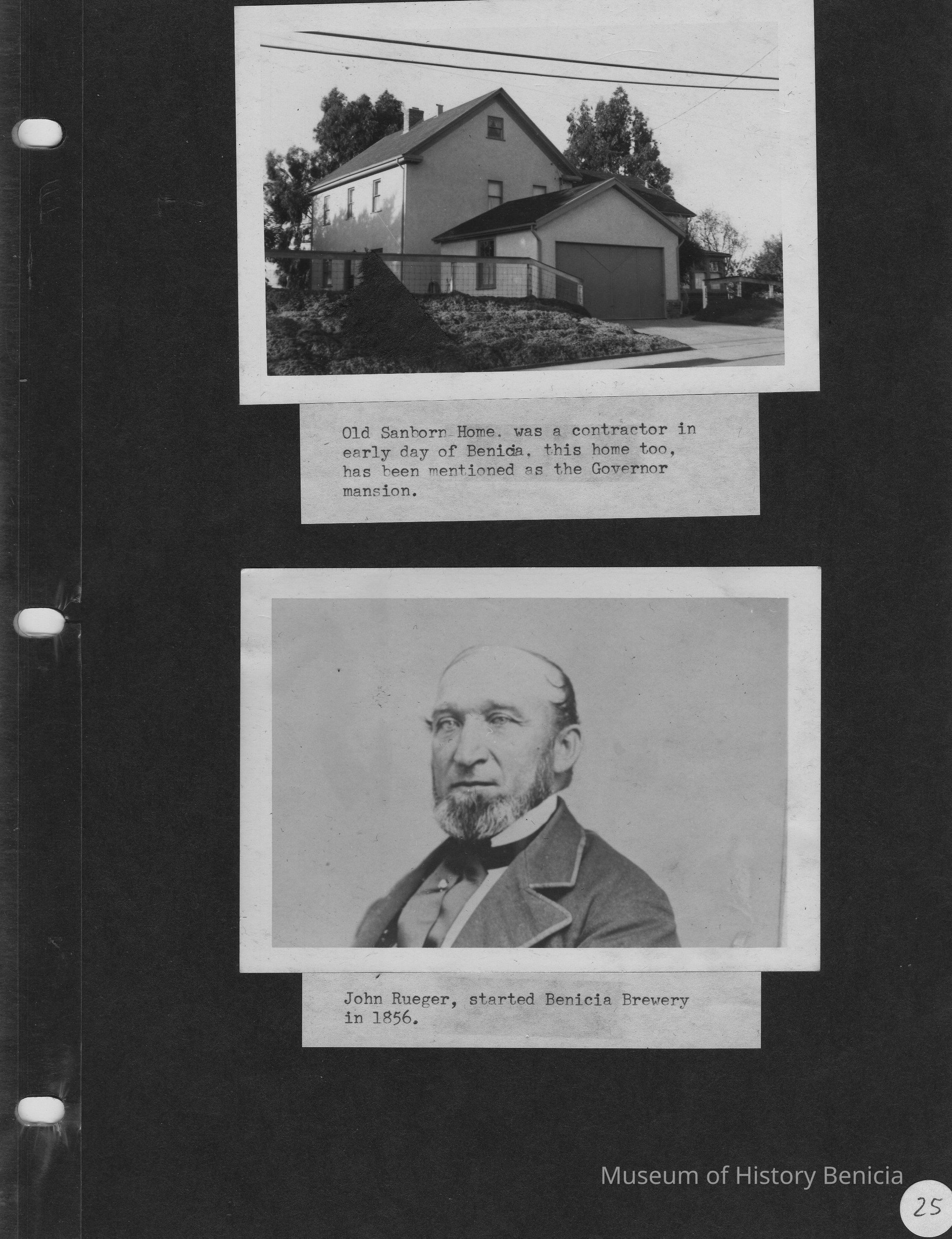 Page contains two B/W photos. Top photo shows old Sanborn home. Bottom photo is a portrait of John Rueger, who started Benicia Brewery in 1856.Collection