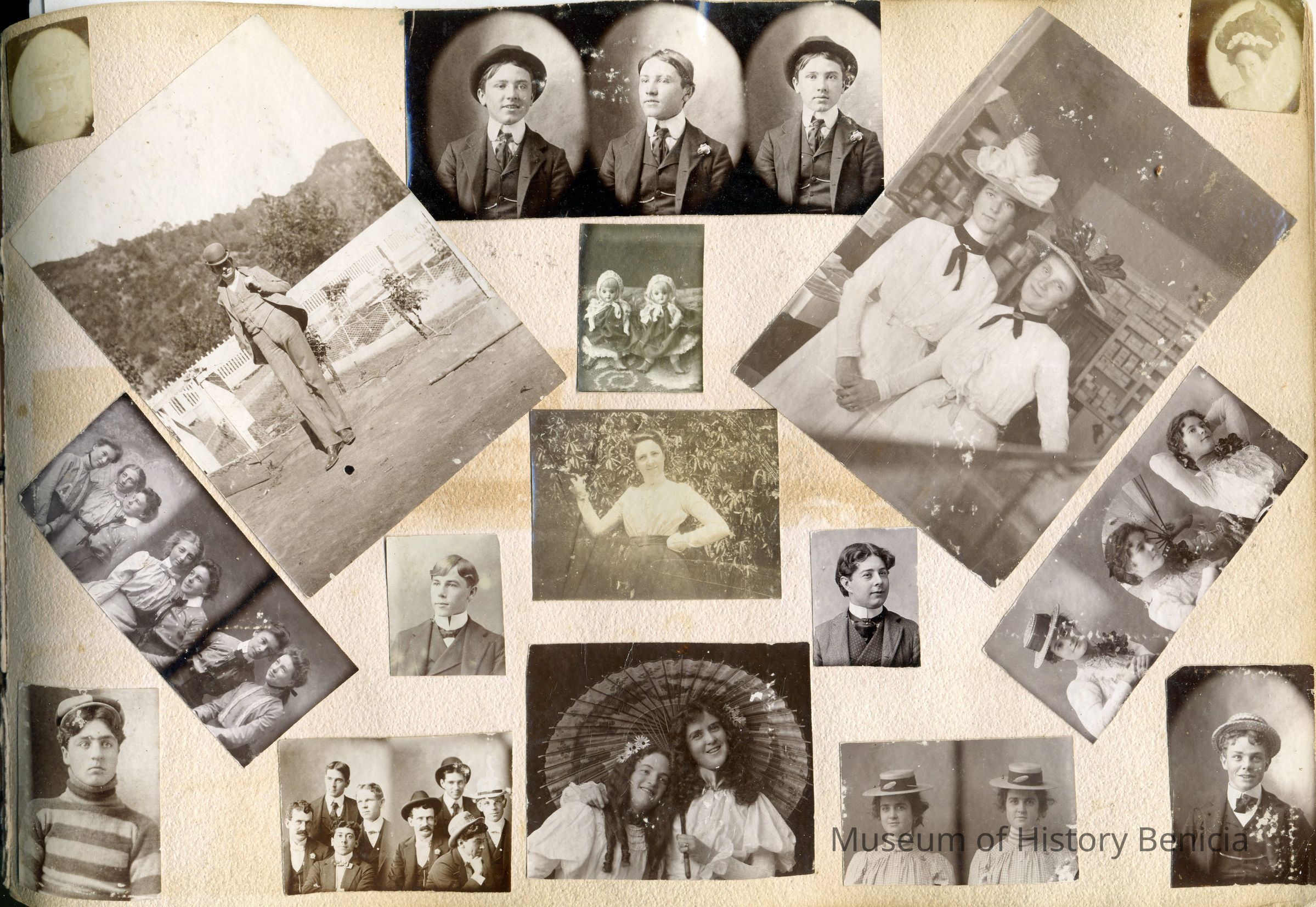 Photo album originally belonging to Allerta Ives (04/1884 - 05/31/1954) of Benicia. Contains mostly pictures of owner's family and friends, but also contains some views of Benicia. Alberta Ives father was Edward H Ives (1858/1863) who in 1900 was a professional studio photographer in Benicia (EH Ives Art Studio). Alberta worked as a teacher in Alameda before marrying Walter M Christie about 1913.