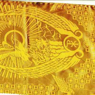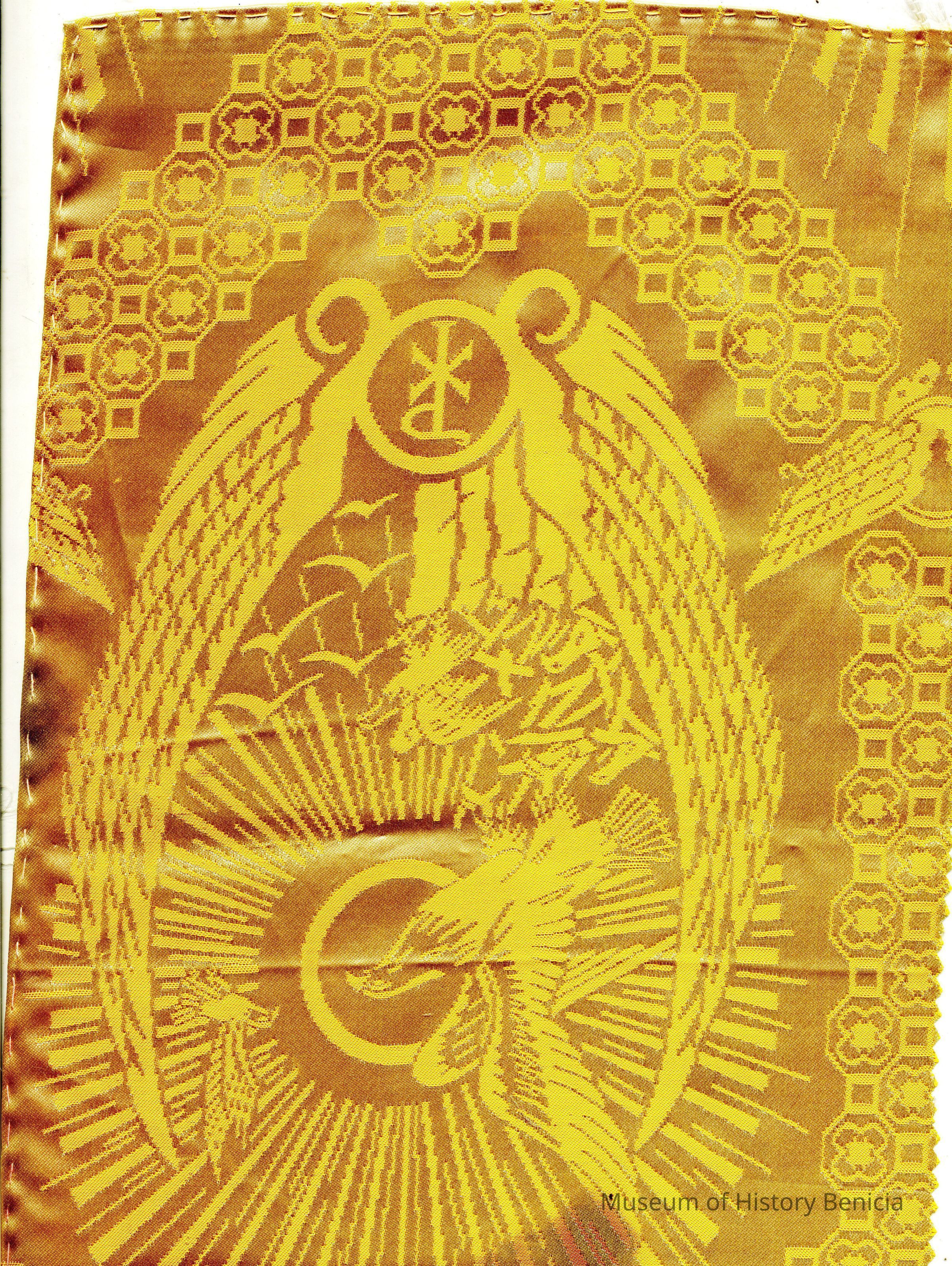 This altarpiece is gold color with a bird in a sunburst pattern in the center and the letters "P and X" intertwined at the bottom. The "P and X" could be the Chi Roho symbol for Christ. This may be part of the items used in a Catholic ceremony. It is 8.5 x 15 inches.Collection
