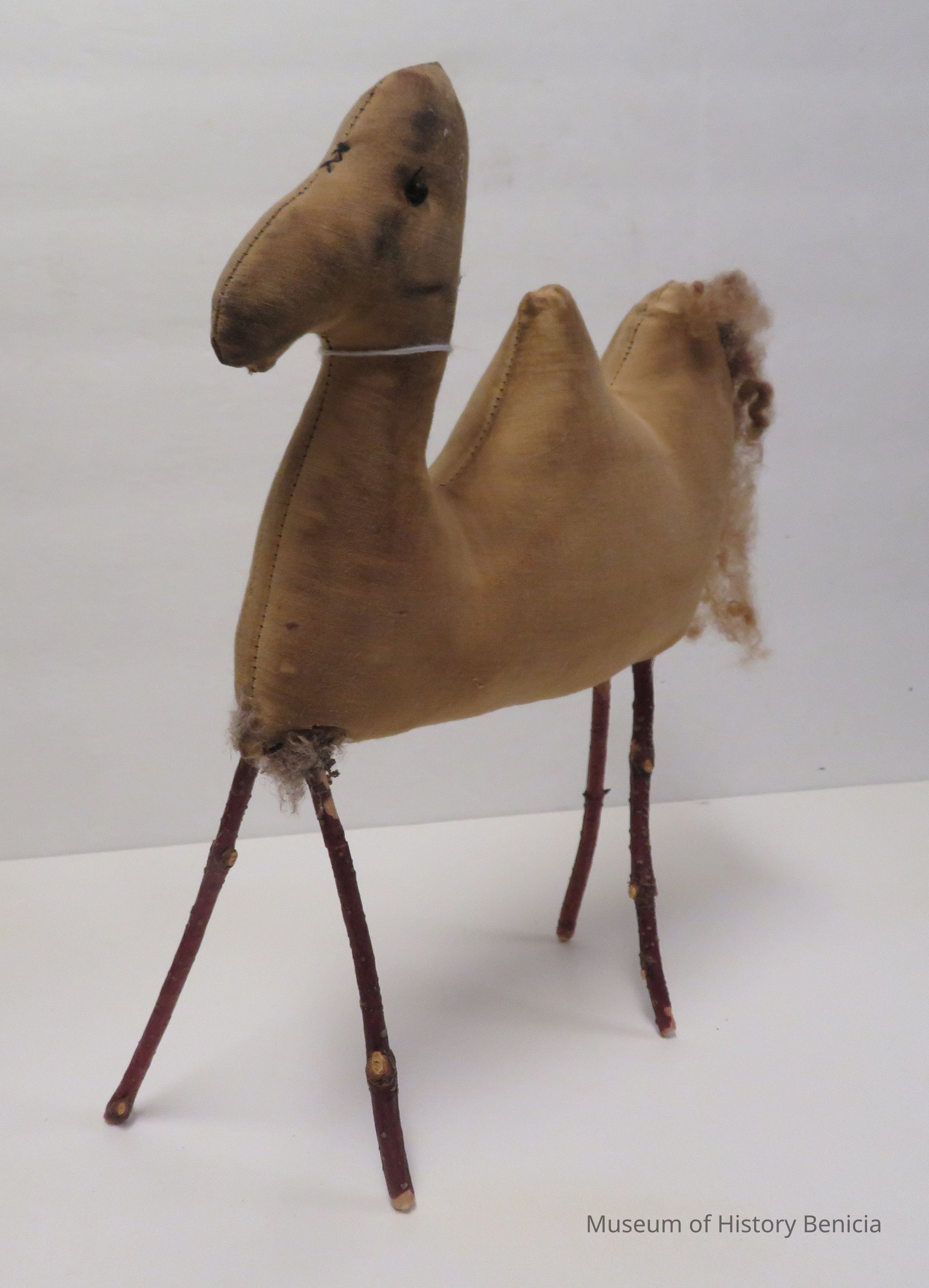 Stuffed cloth body of camel (two humps) with thin brown wood legs and fuzzy tail. 10 1/4"H x 8"L x 2"W