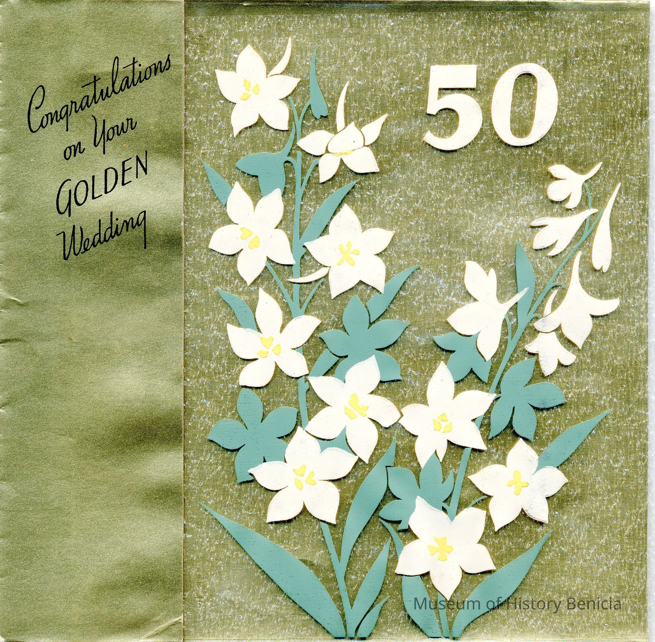 Scrapbook made for the 50th anniversary of Mr & Mrs Joseph DeSilva Sr. The celebration was in 1939 and they were married in 1889. It includes letters, cards, signatures, etc. and the original marriage license.