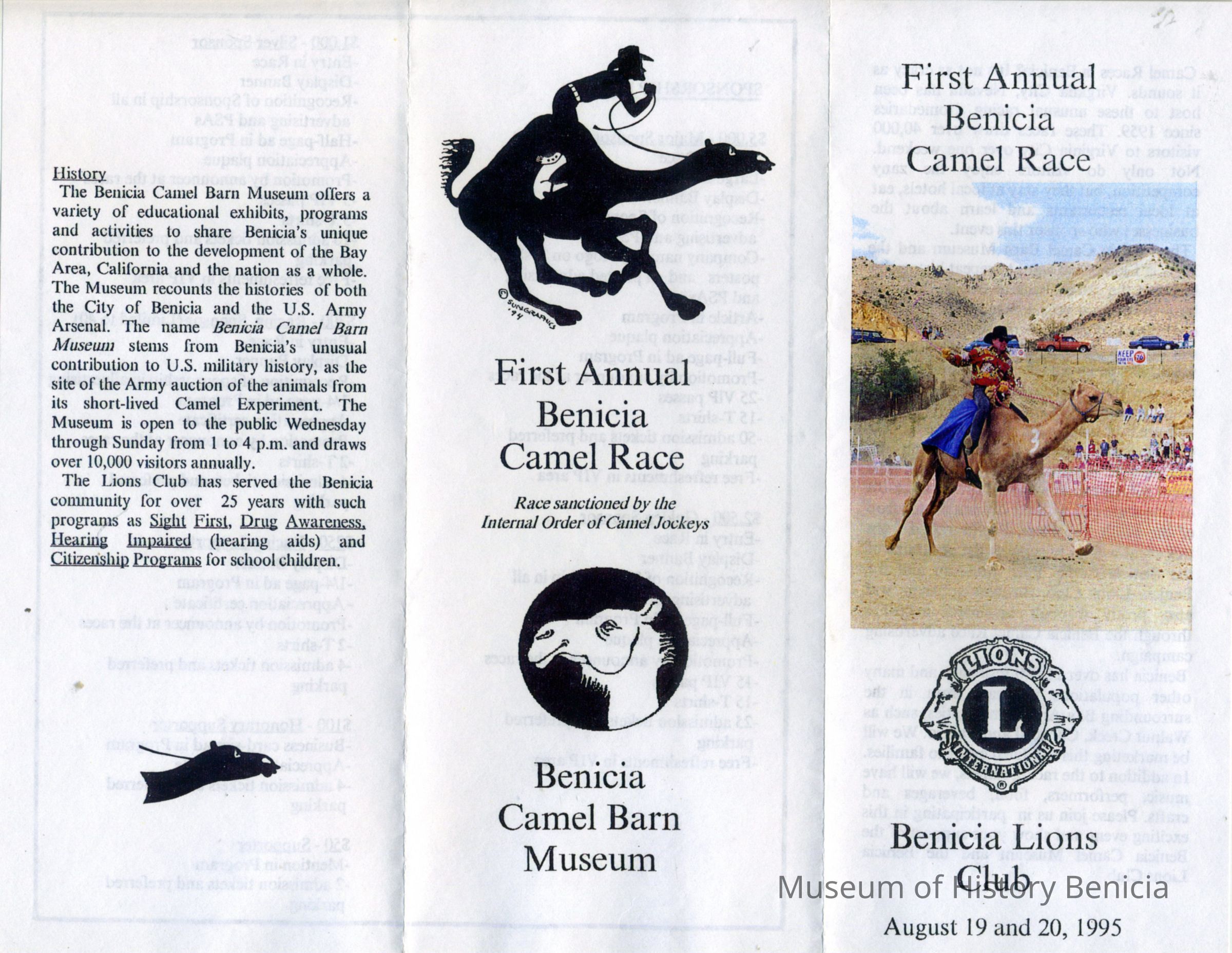 This is the announcement of the first annual Benicia Camel Races. It was held 08/19-20/1995. This announcement is seeking sponsors for the event.Collection