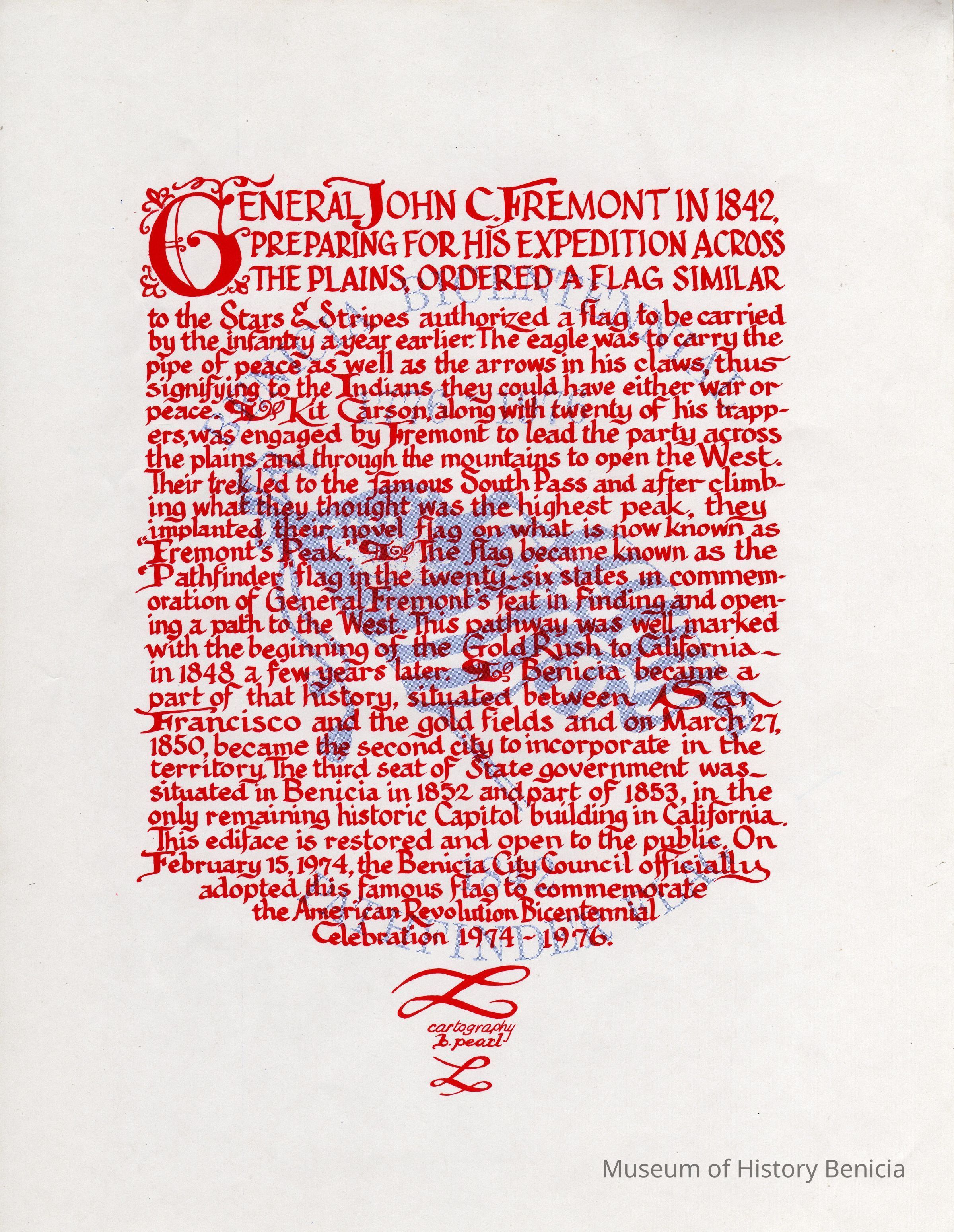 A flyer/letter announcing the adoption of a flag in order to commemorate the American Revolution on its bicentennial, the "Pathfinder Flag". Red print with a watermark of the flag and its name.Collection