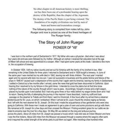 Book on the Story of John Rueger "Pioneer of '49". This is an account of his travels from the East to California for the Gold Rush. It was created by his family from John's accounts.Collection