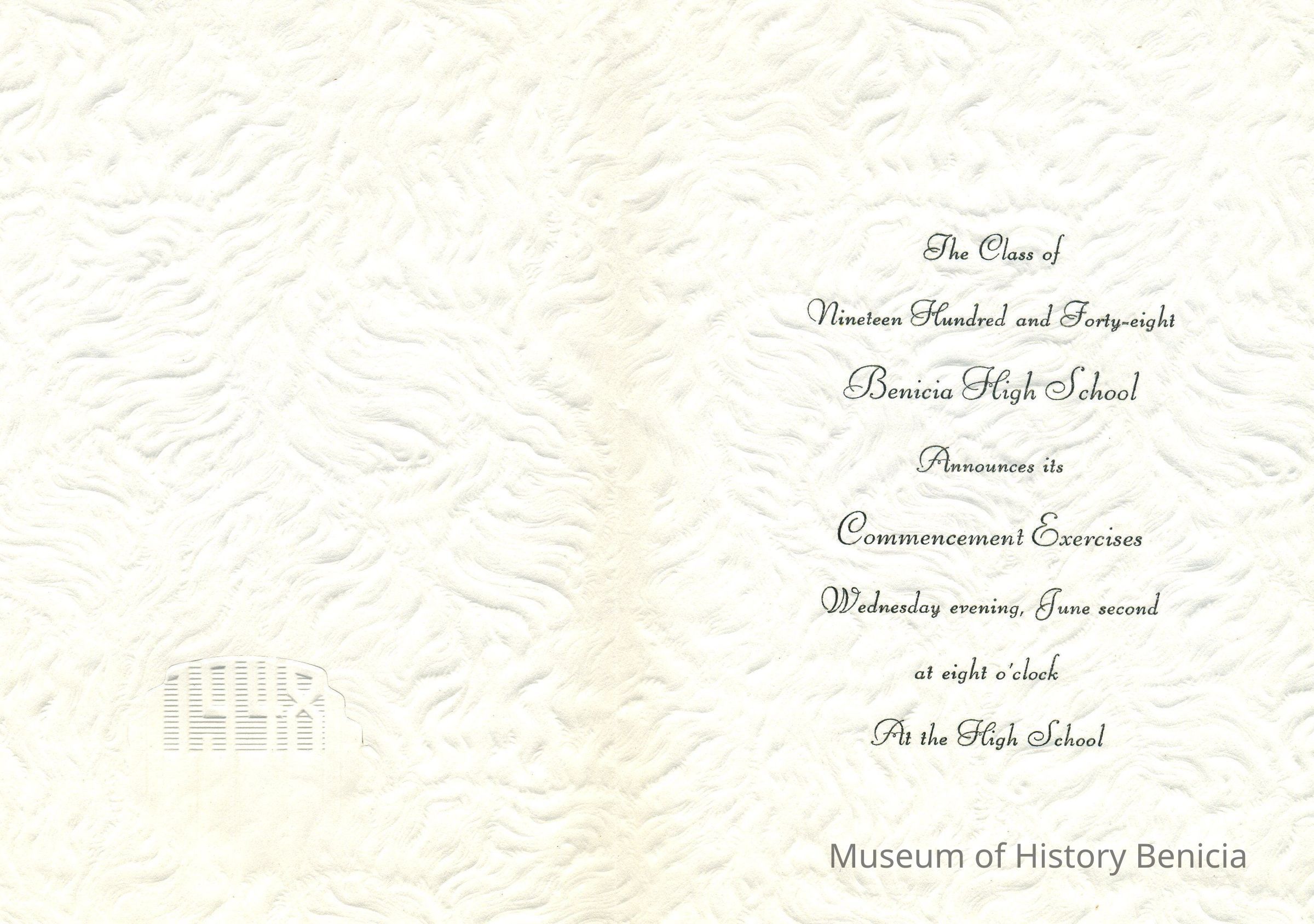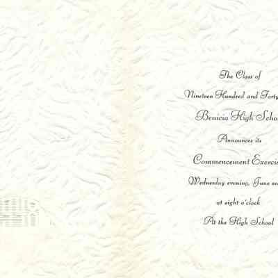 Inside: The Class of / Nineteen Hundred and Forty-eight / Benicia High School / Announces its / Commencement Exercises / Wednesday evening, June second / at eight o"clock / At the High School