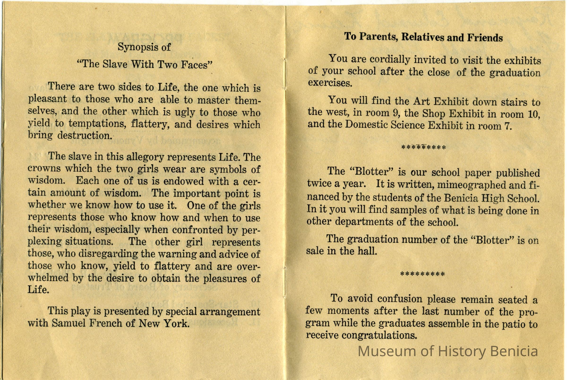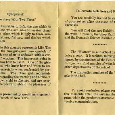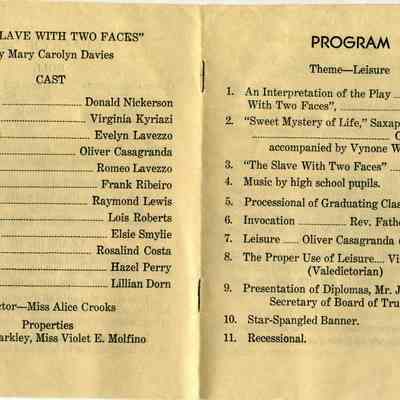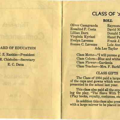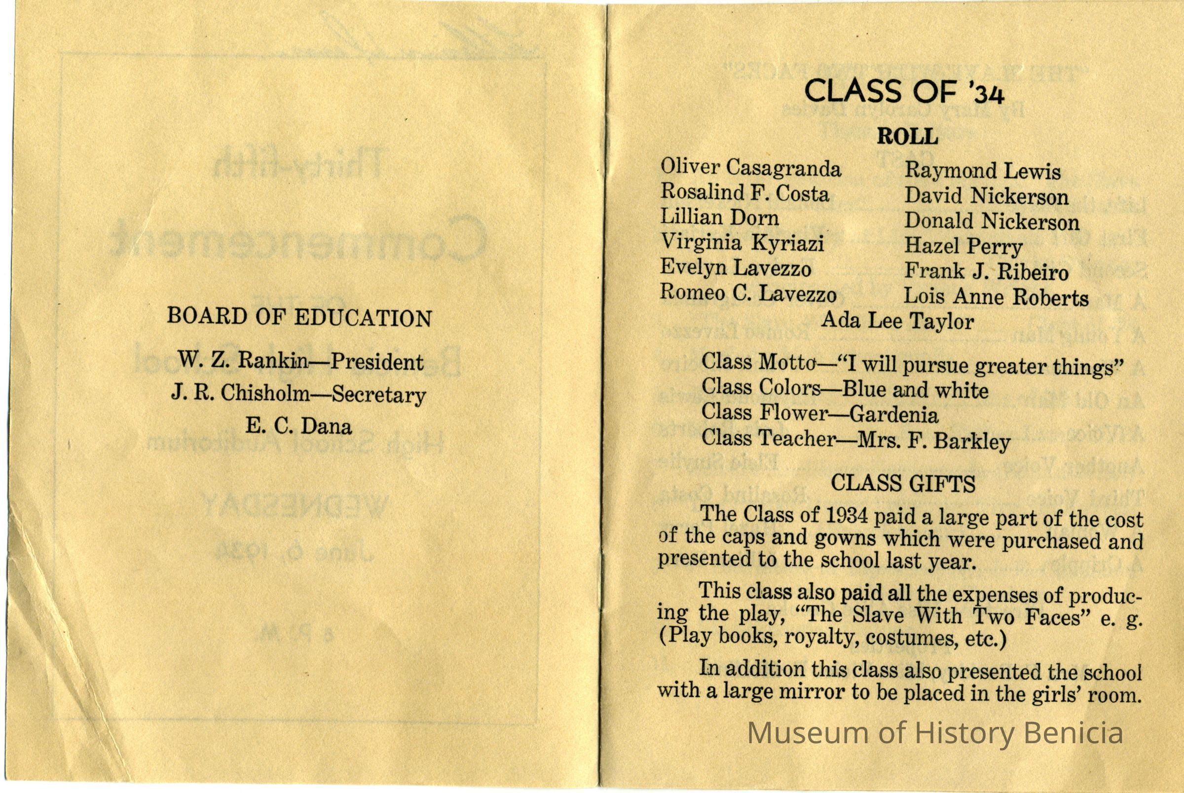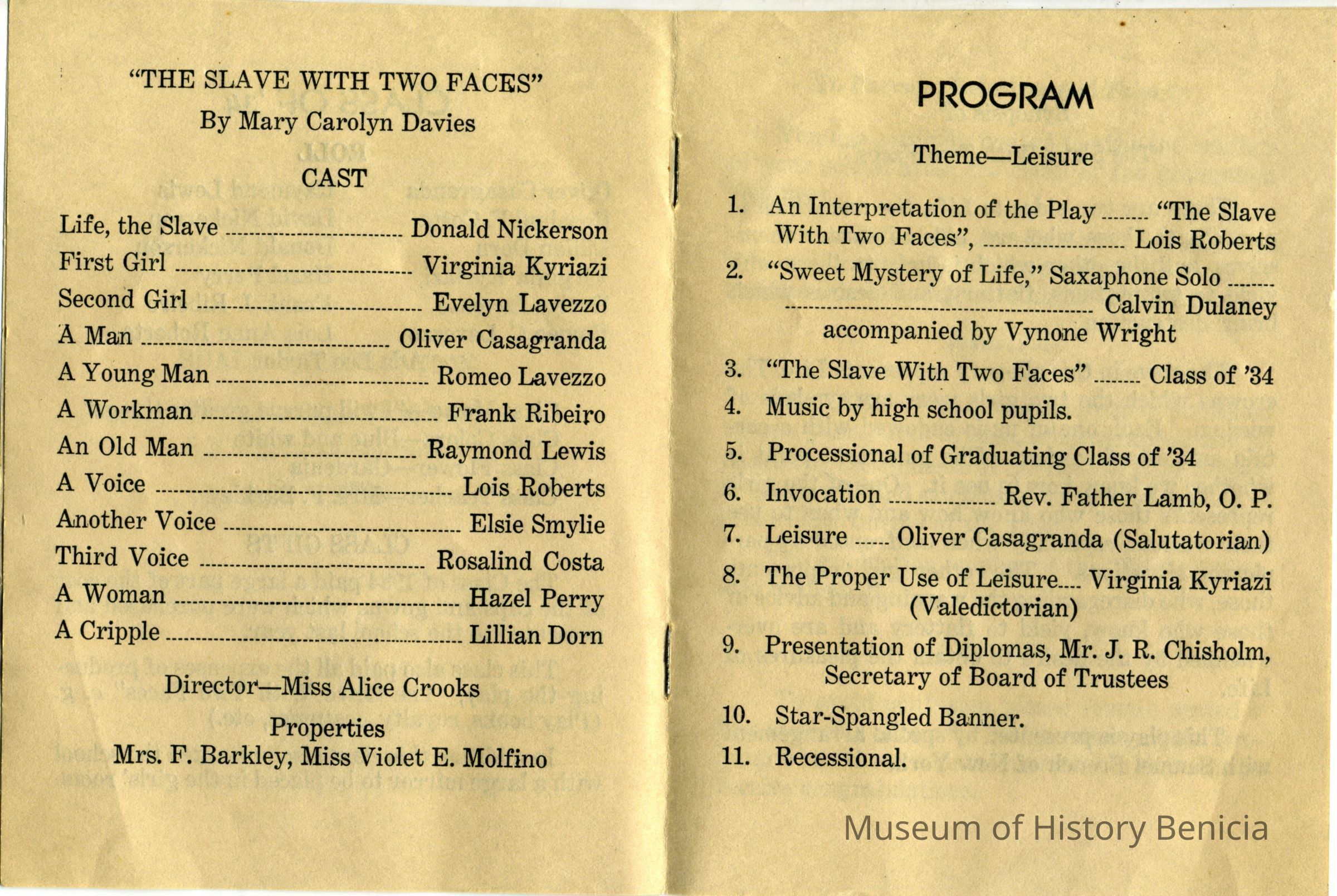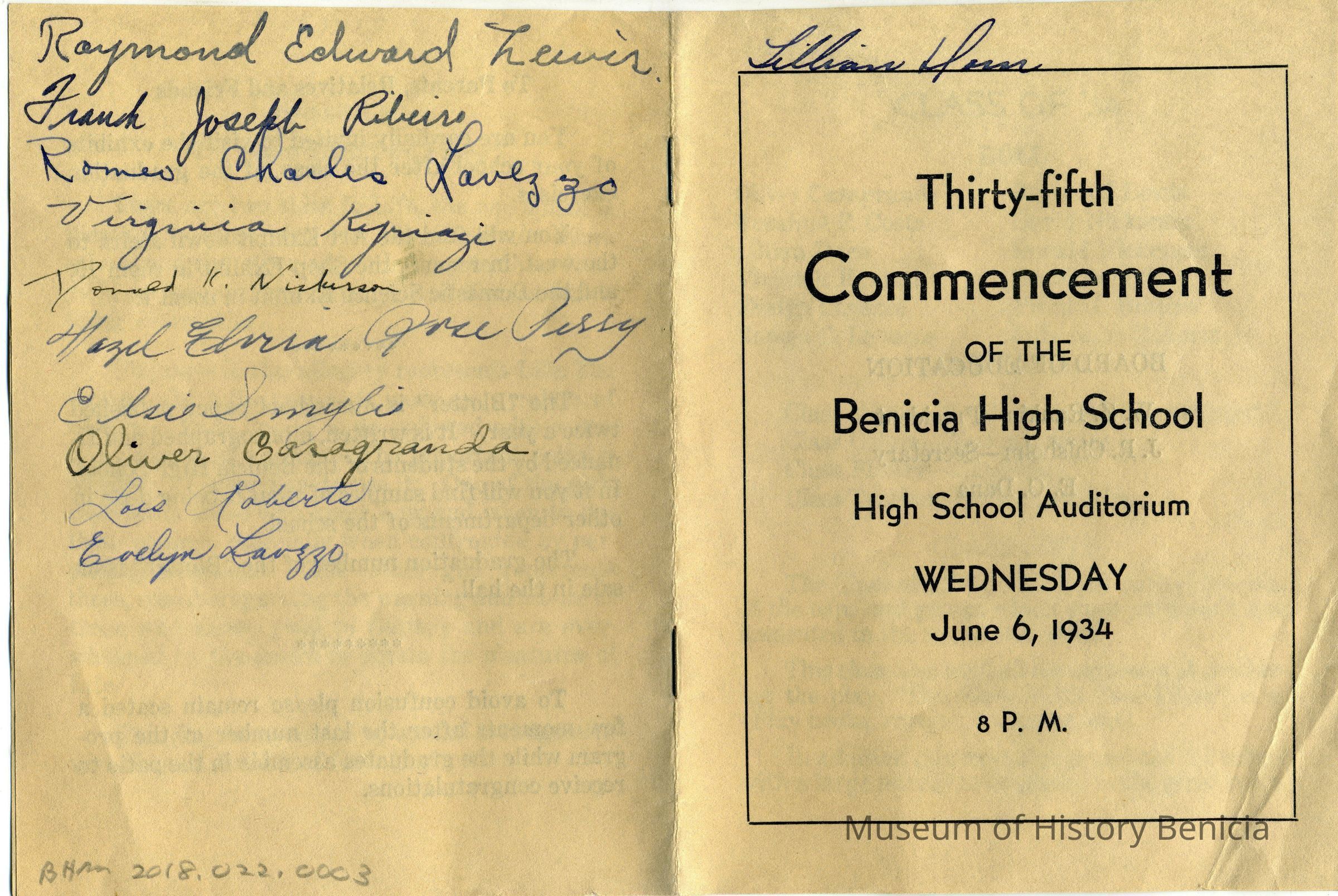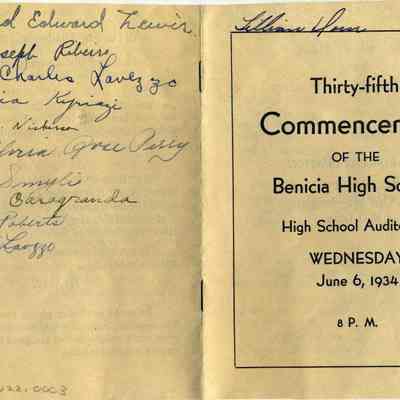 Announcement of the 35th Commencement of the Benicia High School on 06/6/1934. This lists details of the program to be presented. Part of the presentation is a play called "The Slave with Two Faces". Written on the back are autographs of many of the 1934 graduates and a couple of others. Here are the names listed on the back: