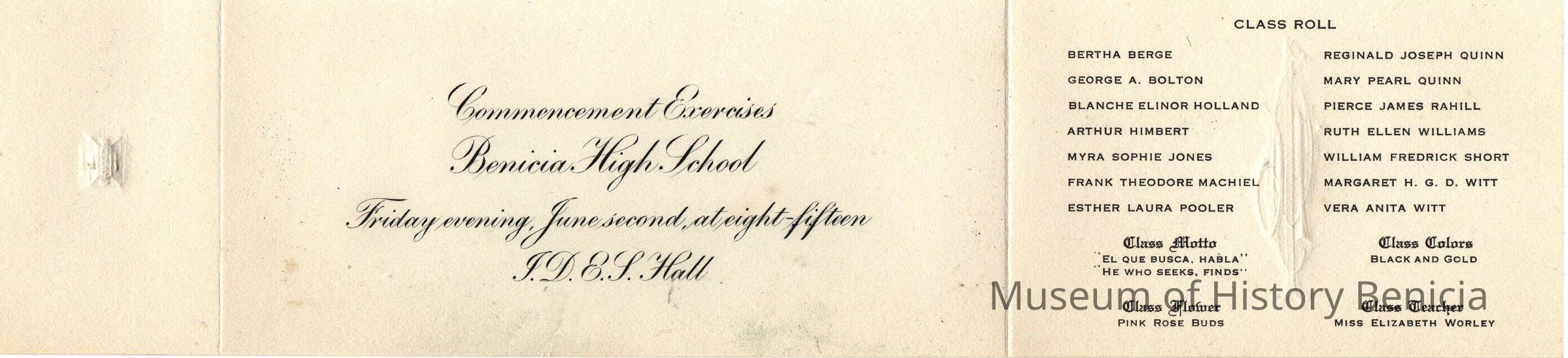 Benicia High School Class of 1916 Graduation Announcement: