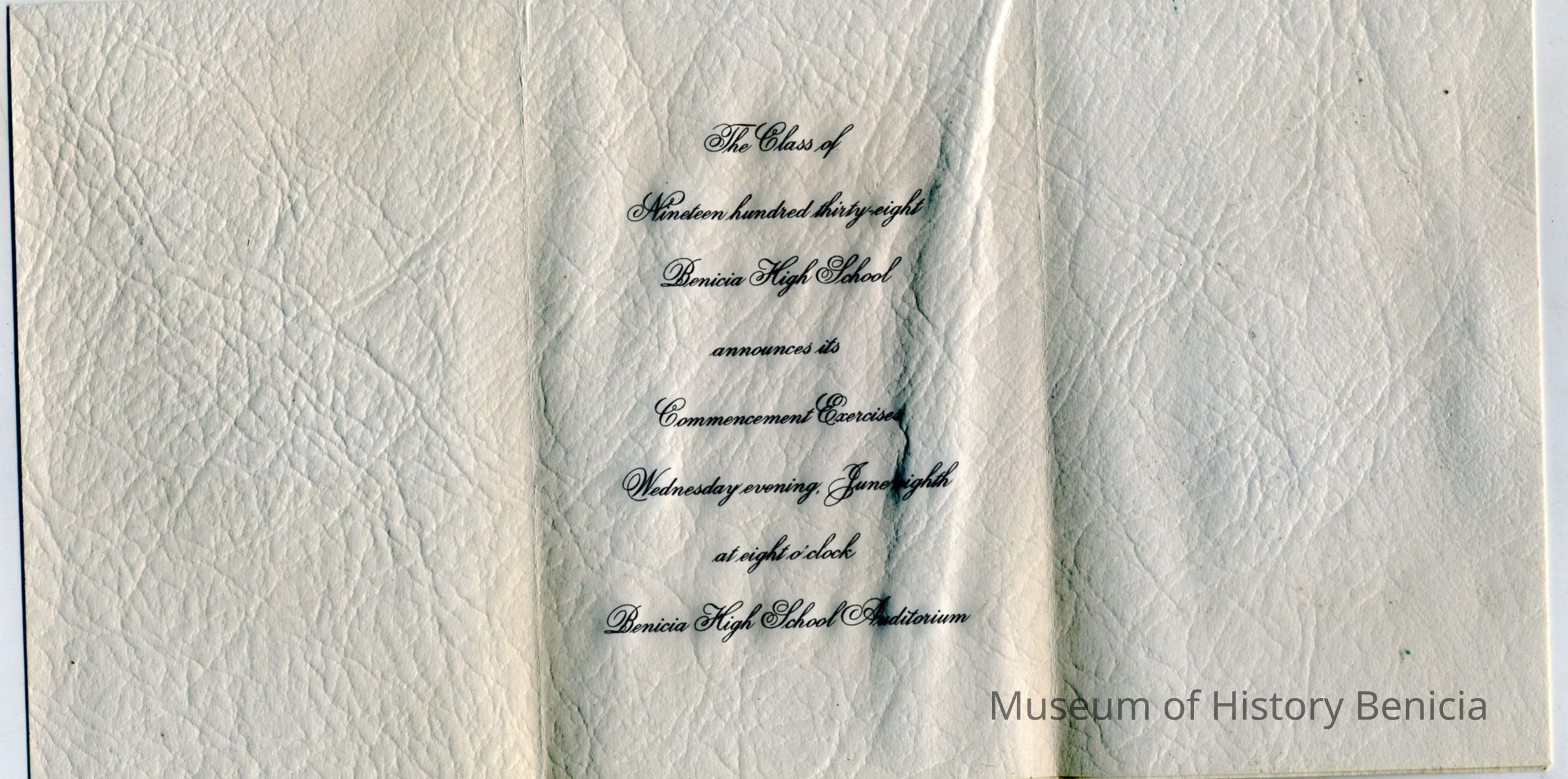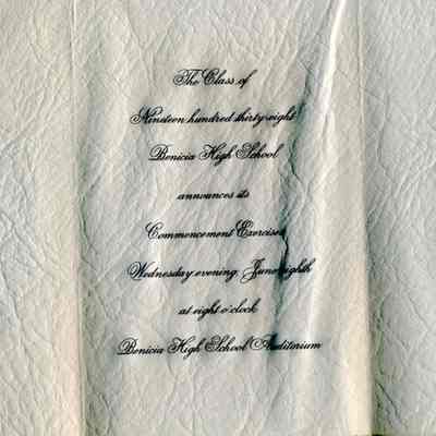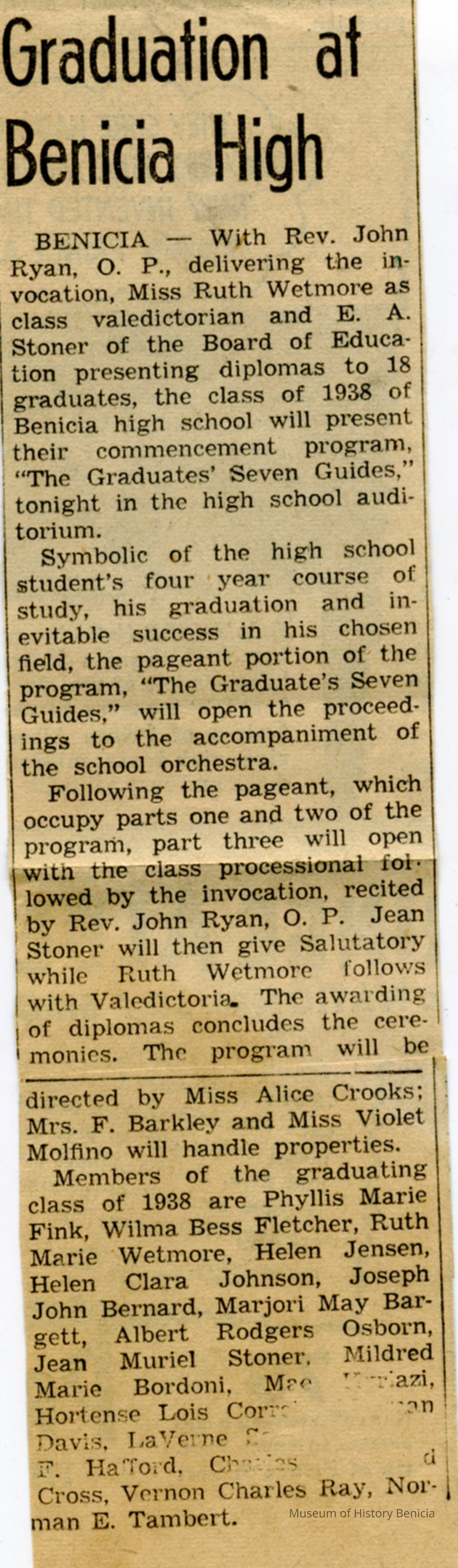 This is a graduation announcement and newspaper clipping for the 1938 Benicia High School graduation. The announcement was for Harry Wassmann who, because of illness, actually graduated with the class of 1939.