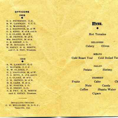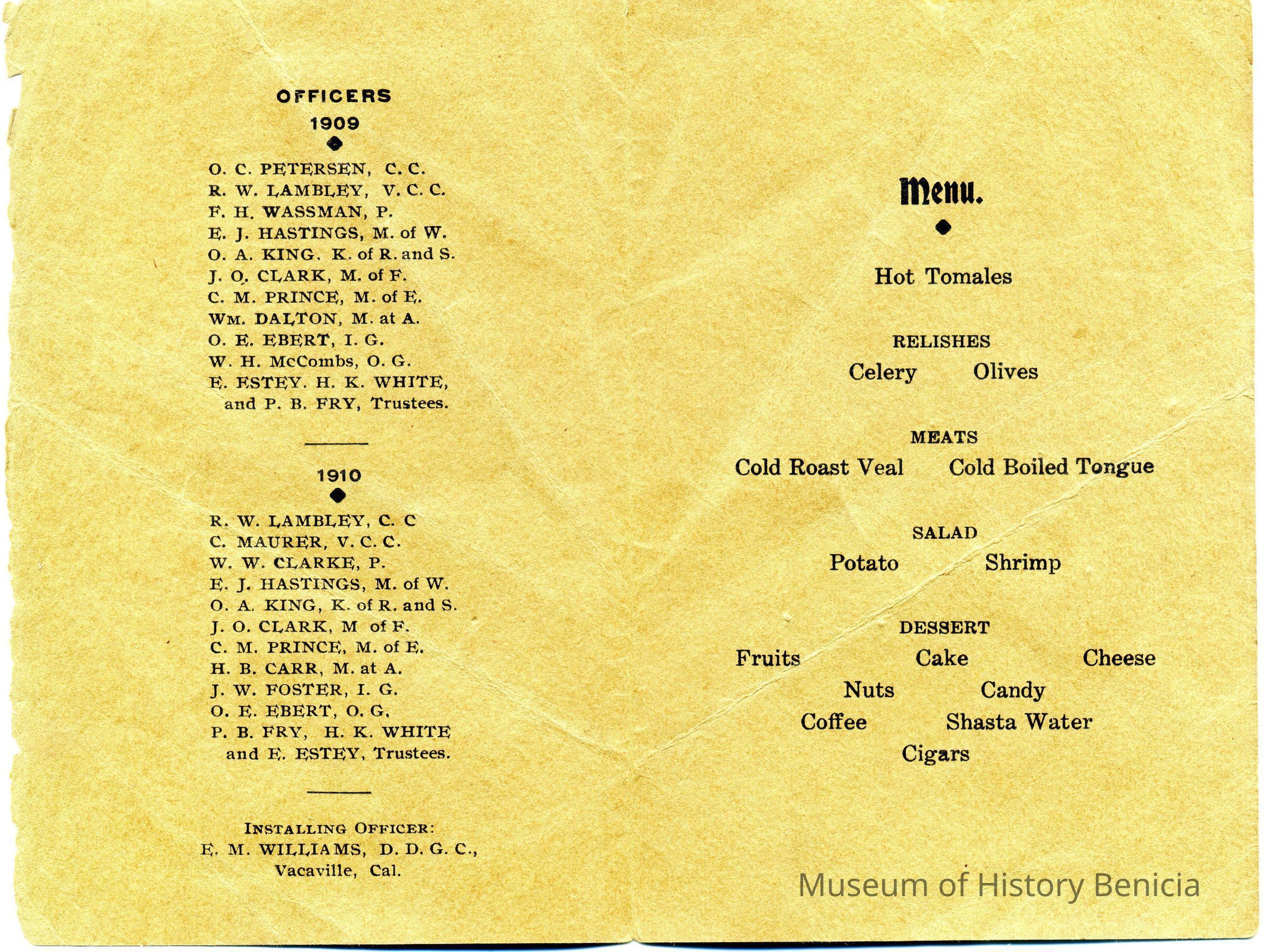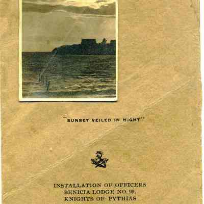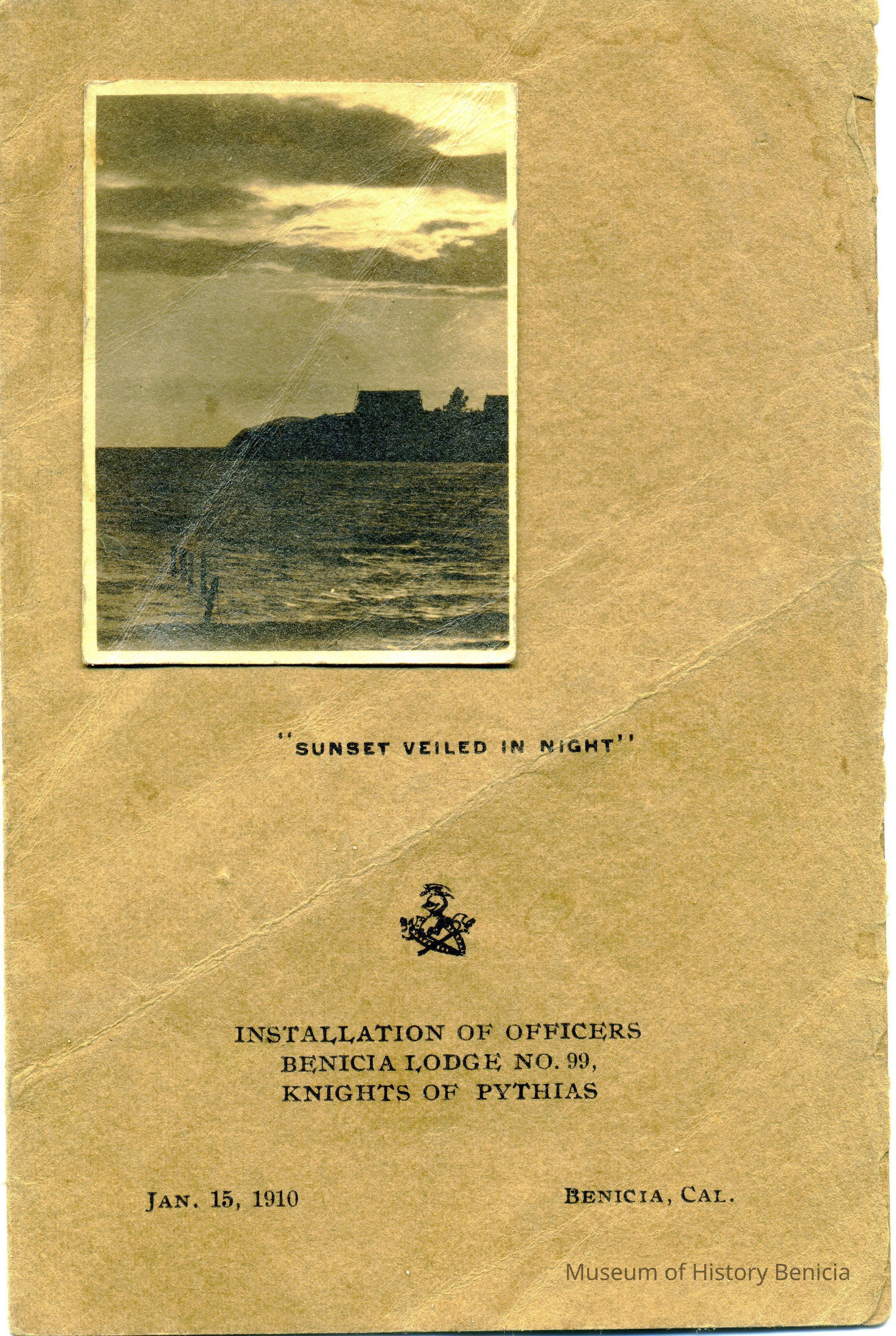 This is an announcement for the installation of officers in 1910 at the Knights of Pythias Lodge No. 99 in Benicia. The announcement has a photo of the Silver Gate on the cover. This could be the photo taken by Oscar Petersen since he is known to be a photographer and a member of the Knights of Pythias.Collection