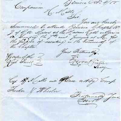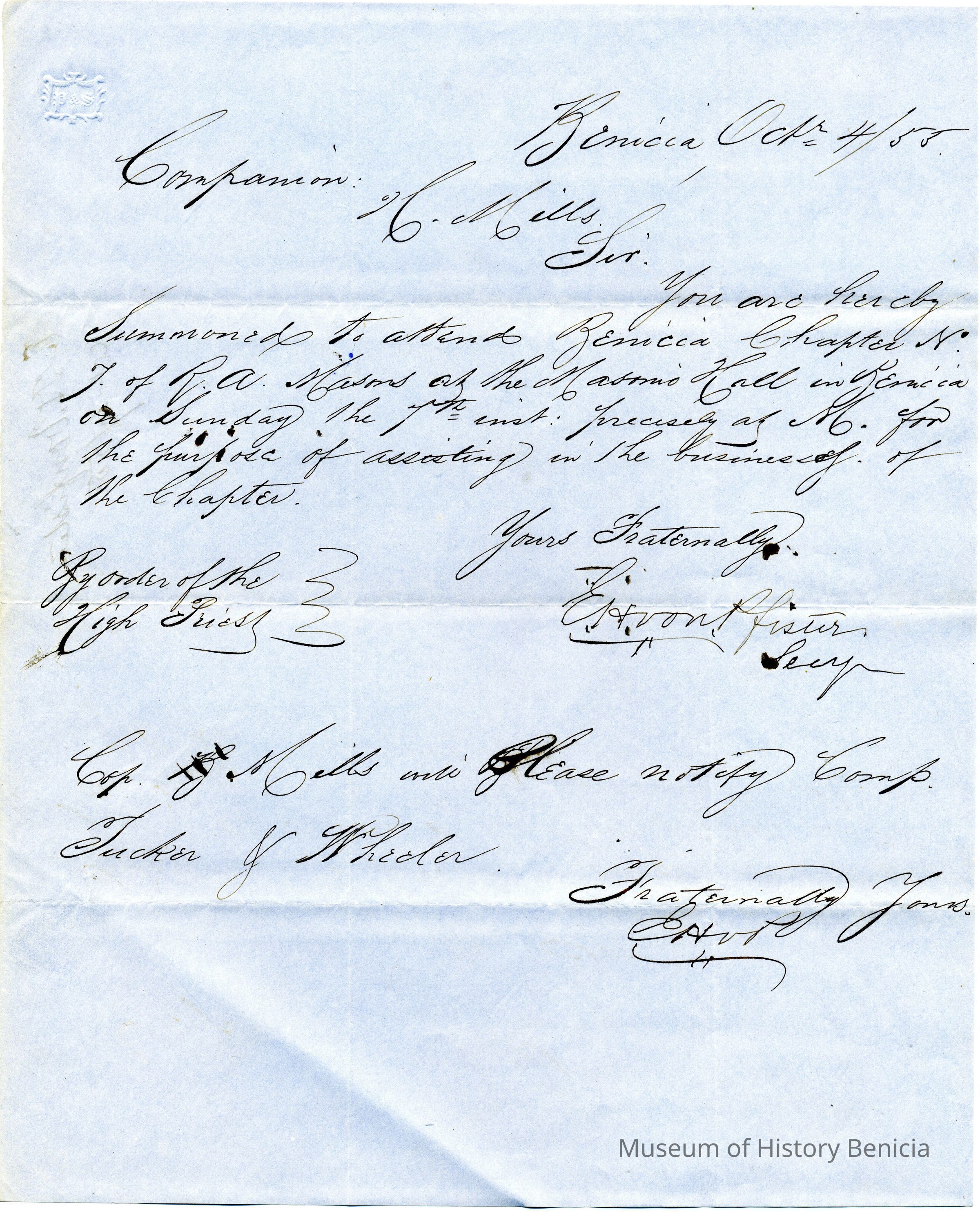 "You are hereby summond to attend Benicia Chapter No. 7 of R.A. Masons at Masonic Hall in Benicia on Sunday the 7th inst. precisely at 6 for the purpose of assisting in the business of the Chapter."