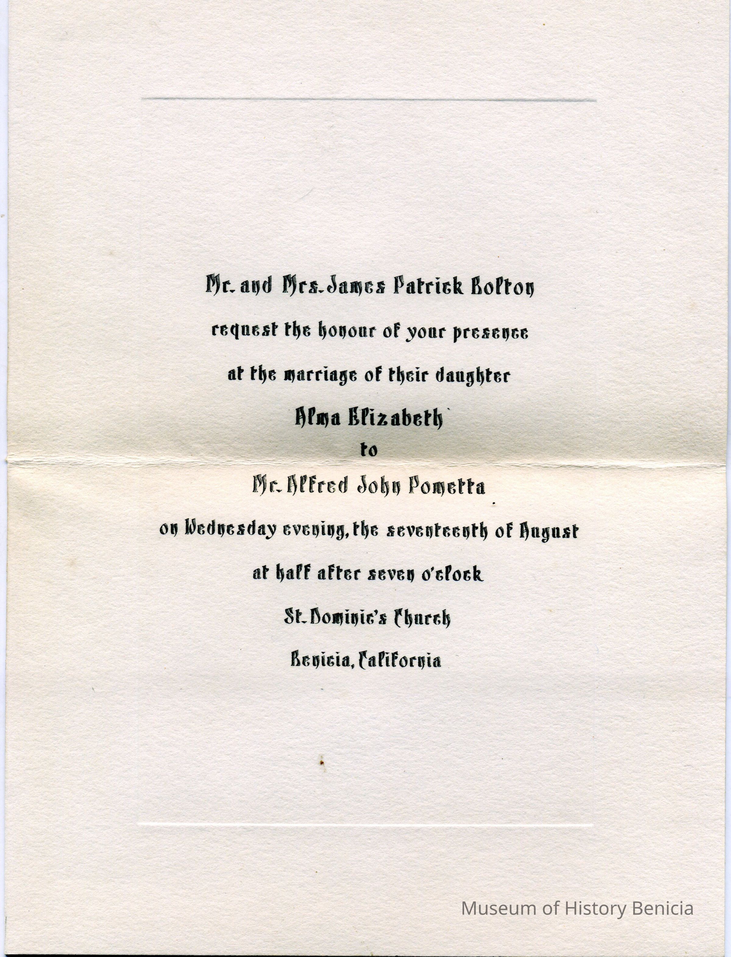This is an announcement of the marriage of Alma Elizabeth to Alfred John Pometta at St Dominic's church in Benicia. The year isn't shown but based on the 1930 US Census they were married in 1927.