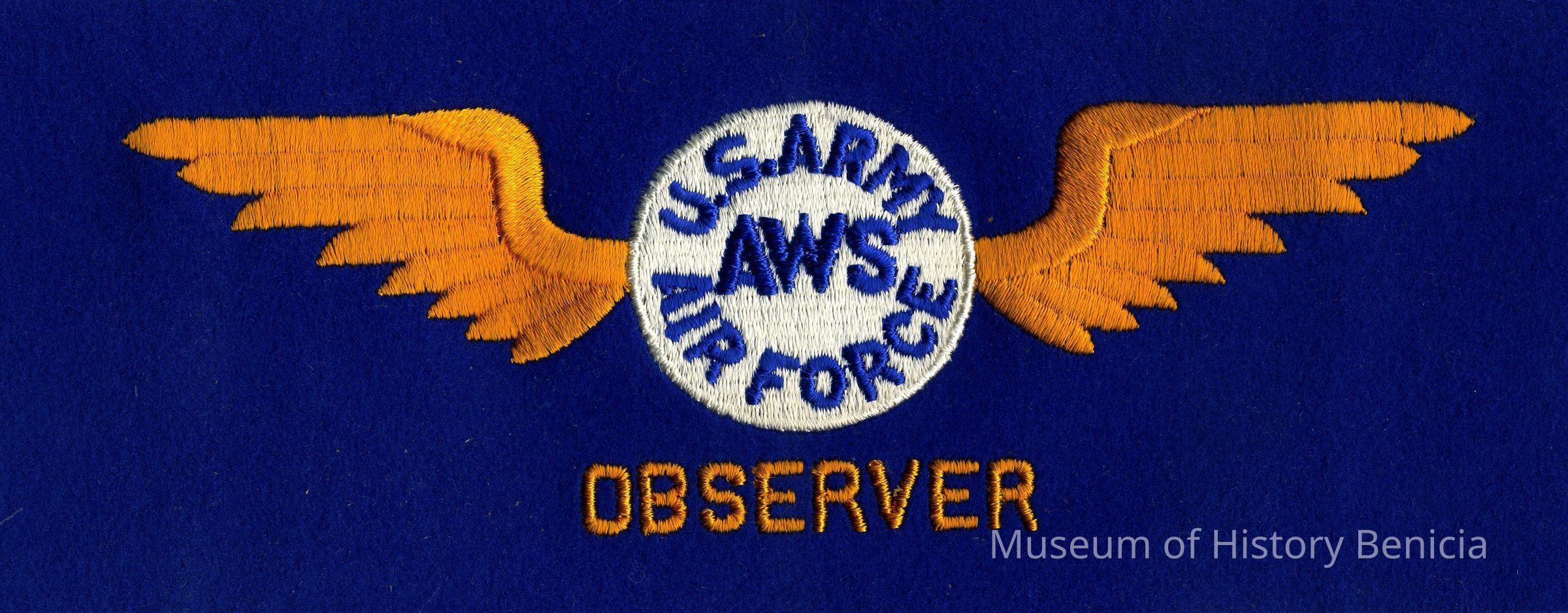 United States Army Air Force Air Warning Service Observer armband; yellow embroidered wings with white center circle on royal blue felt; blue embroidered letter text "U.S. Army Air Force AWS" on centr circle; yellow letter text "Observer" below wings. 18" x 4-1/8"