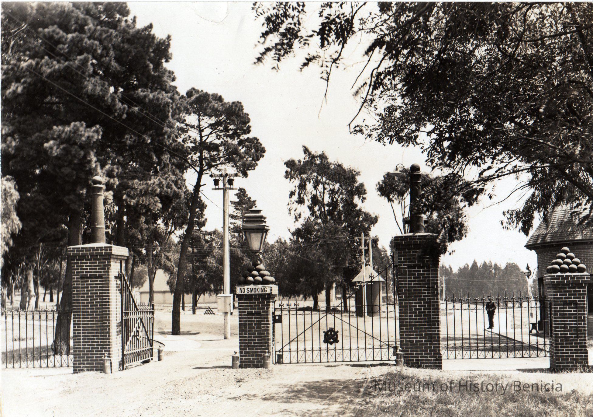 B/W photograph of the Benicia Arsenal entrance on Military East. Gate is wrought iron and brick with faux cannon and cannon balls stacked in a pyramid shape.Collection