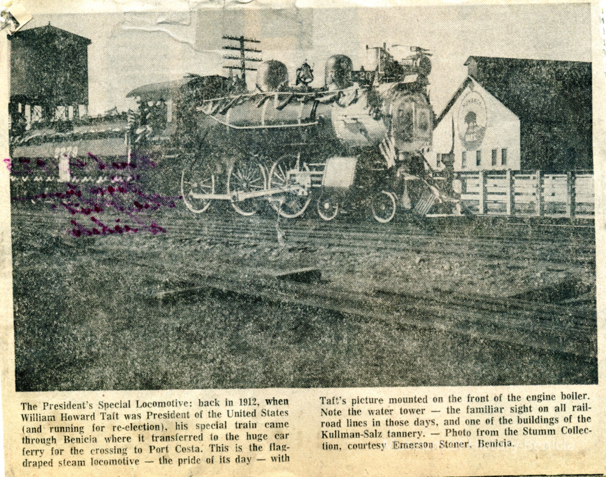 newspaper photo and description of a photo of the train that carried President Taft in 1912 when he visited California. It is taken from a 03/04/1973 newspaper. The back has an inscription "Pages from the Post" Nichols.