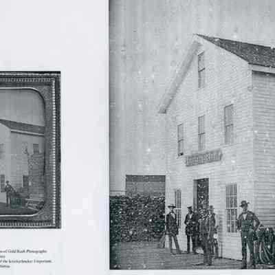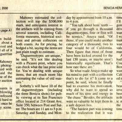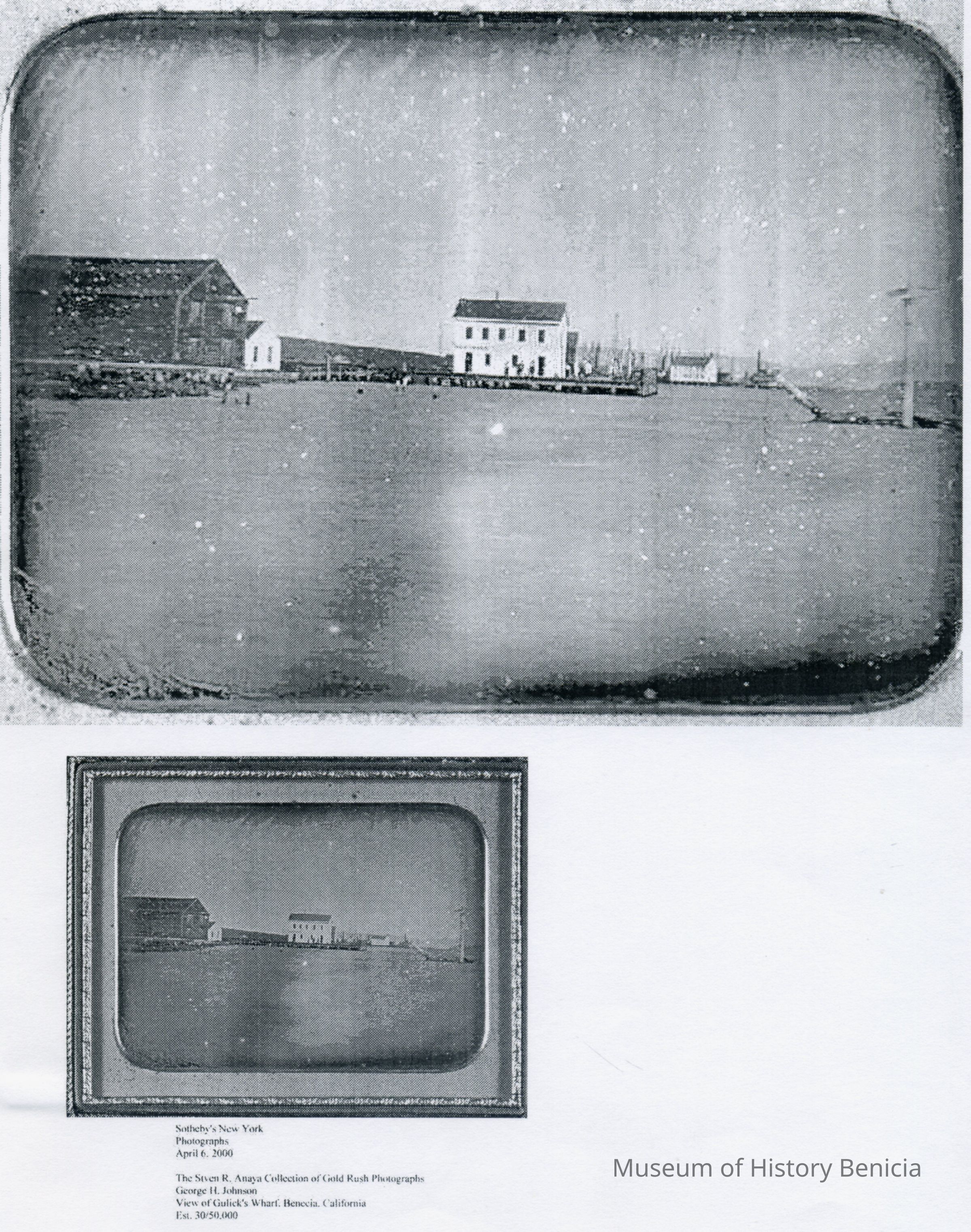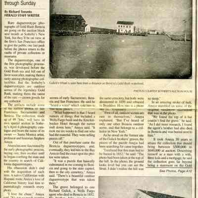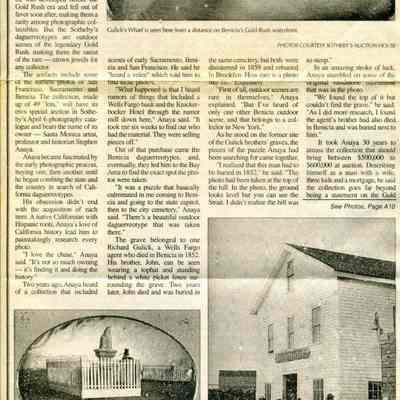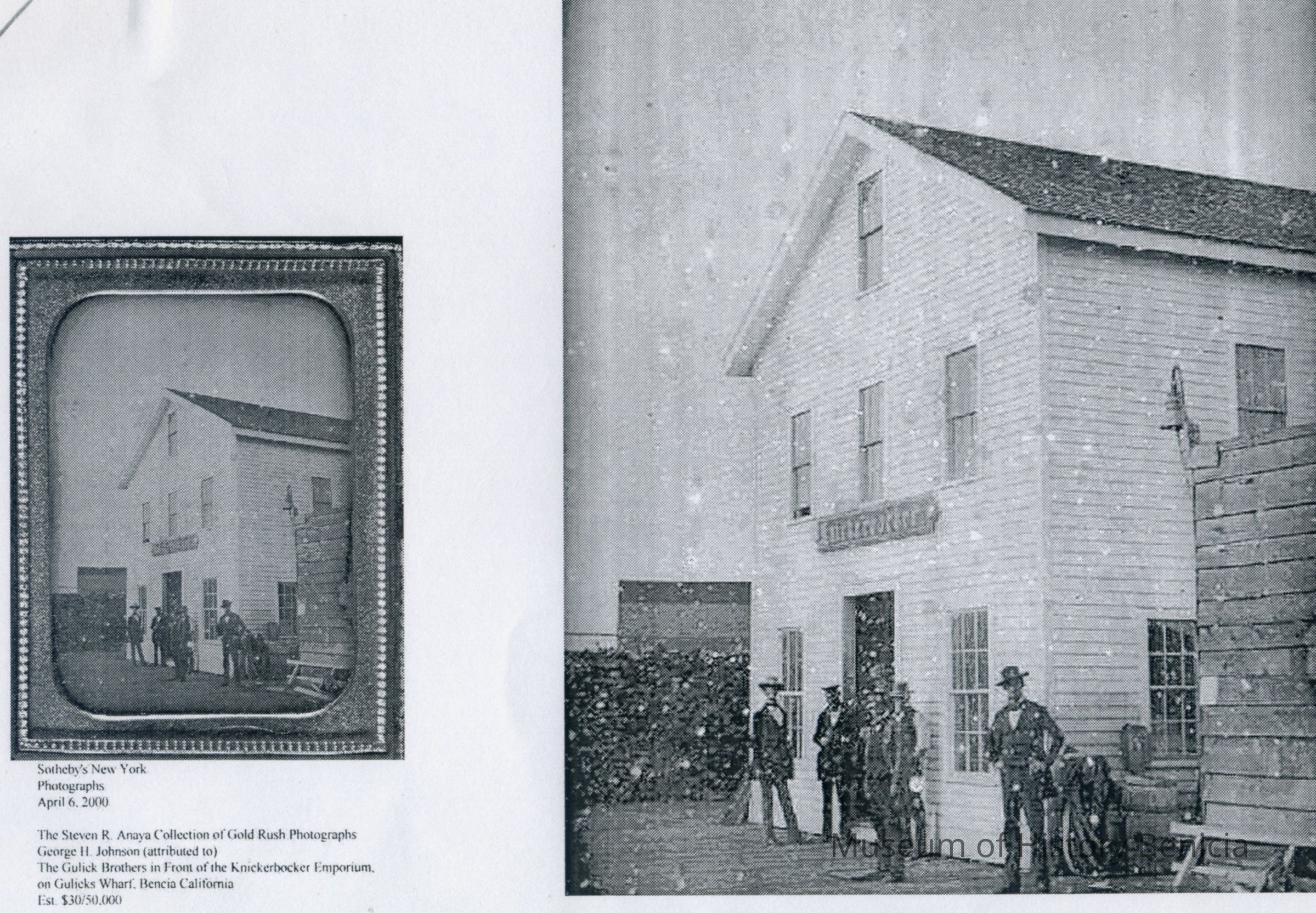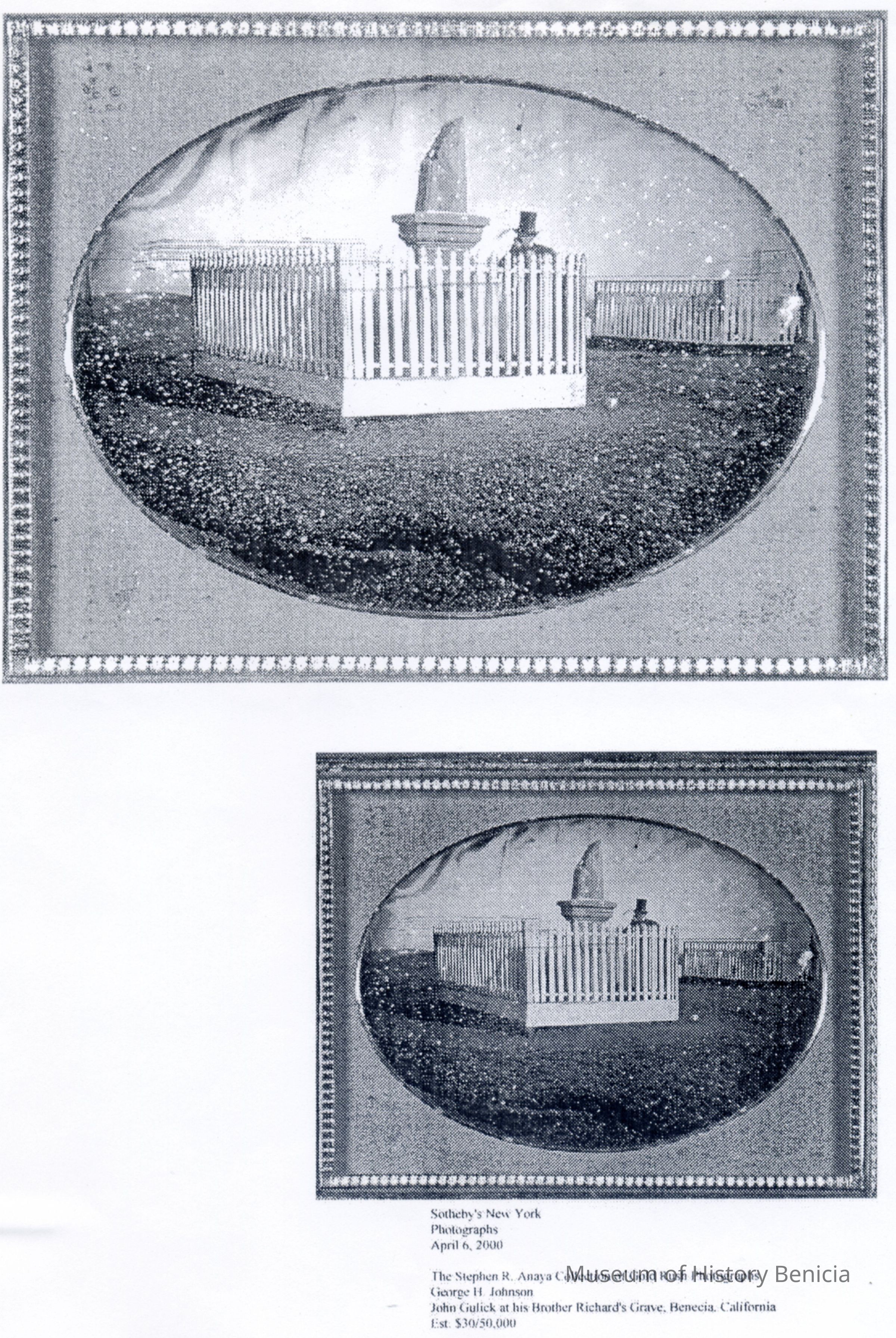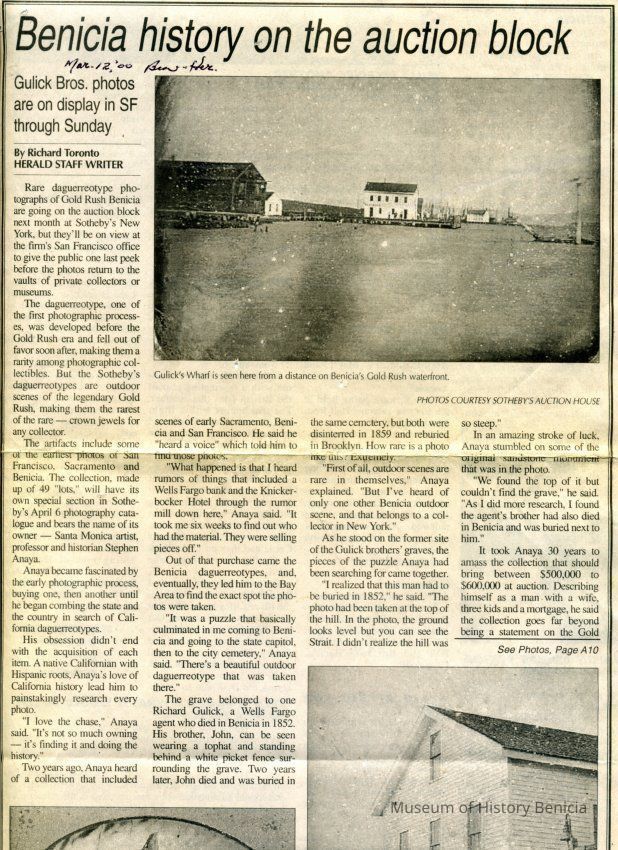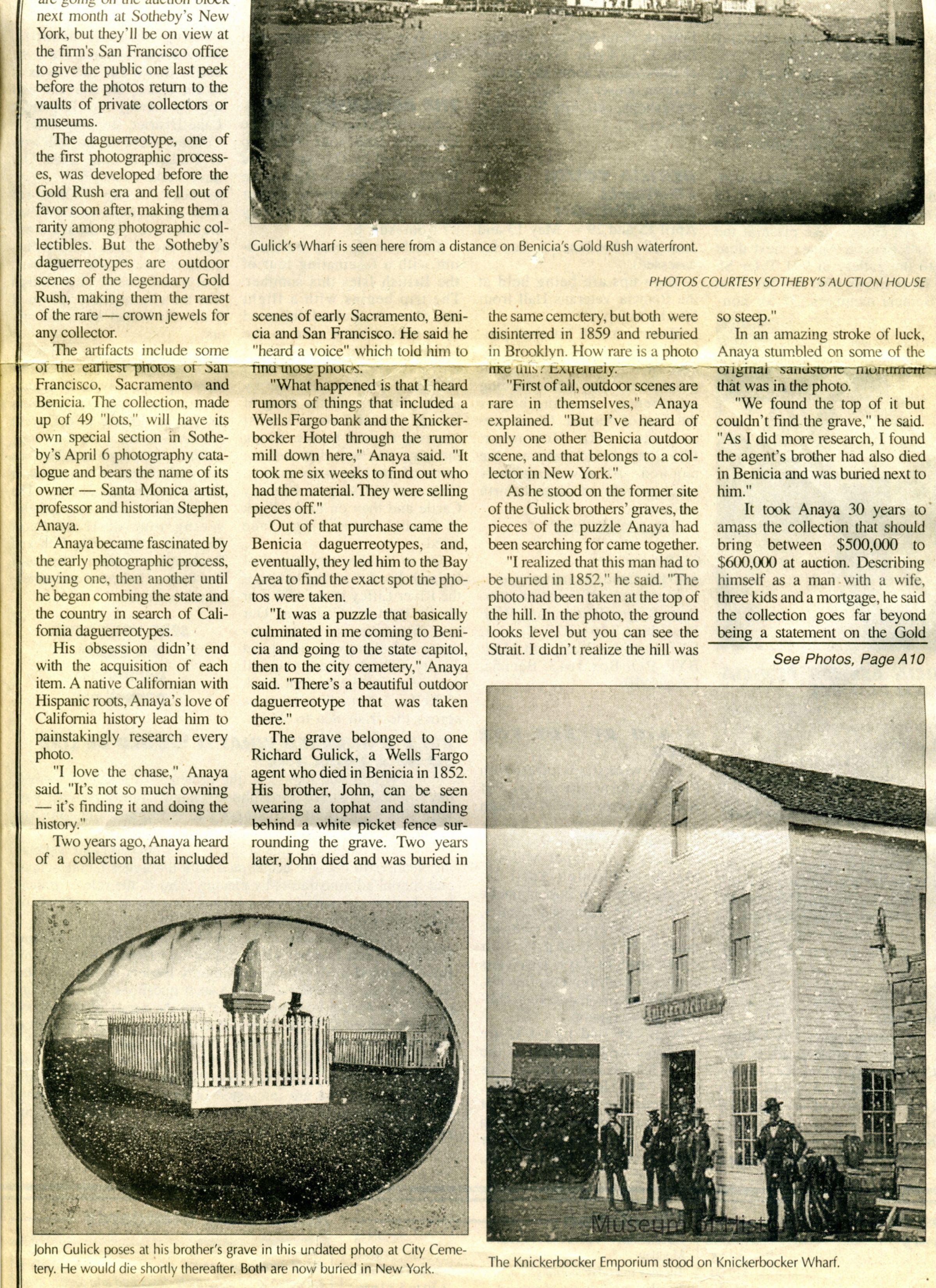 This is a news article about an auction of Gold Rush era daguerreotype photographs. It is from a collection owned by Stephen Anaya. Among the collection are three early images of Benicia. The three Benicia daguerreotypes are eighth plate images. One shows the Benicia waterfront called "Gulick's Wharf". Gulick was the name of brothers that lived in Benicia around 1850. They owned the Knickerbocker Emporium on the Benicia wharf. Another photo shows the grave of one of the brothers who died in 1852, Richard Gulick. Two years later his brother John died. They were both buried in the Benicia cemetery but then disinterred and reburied in Brooklyn, NY.Collection