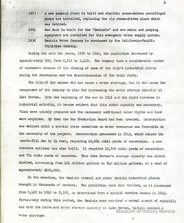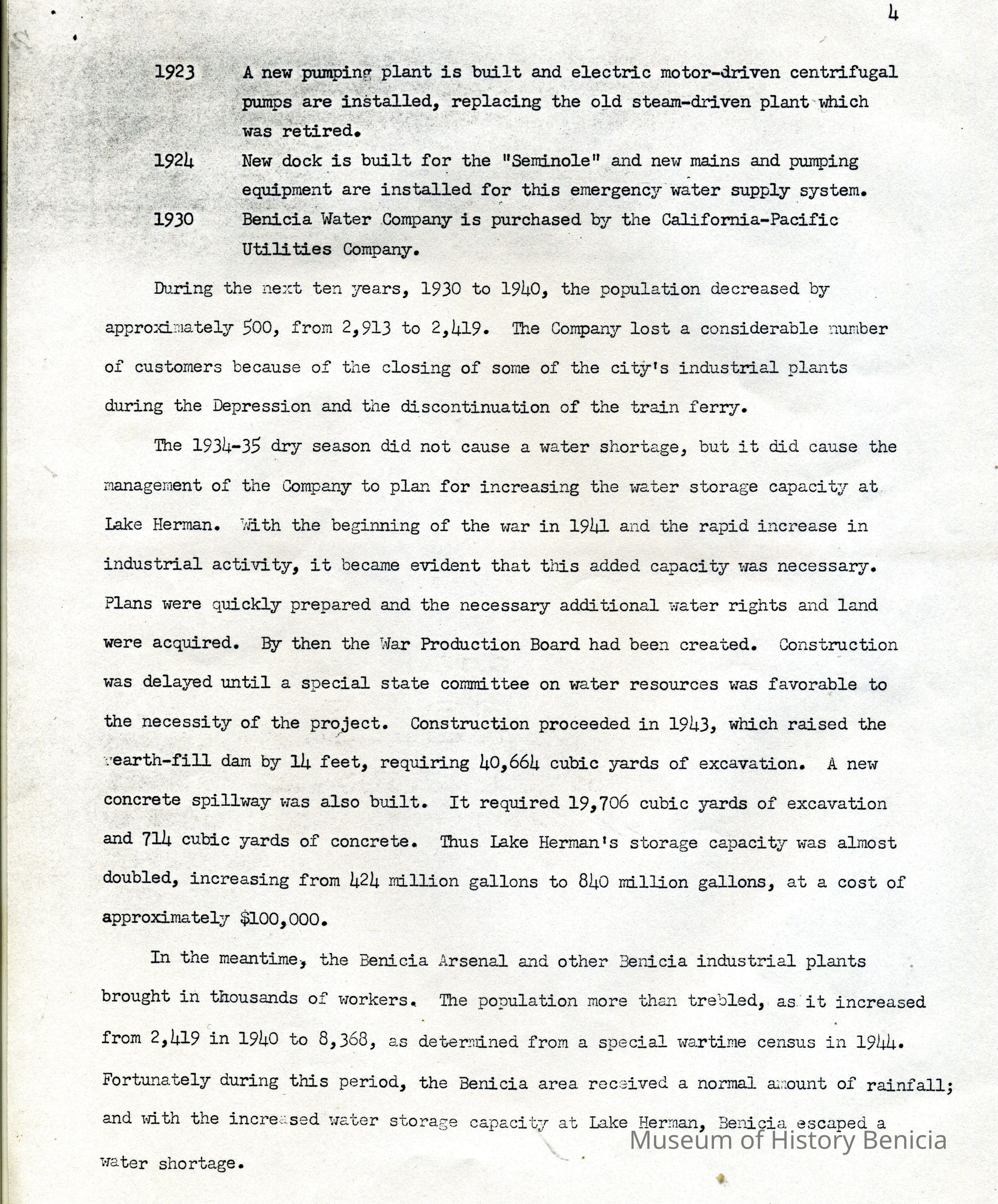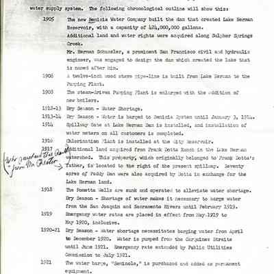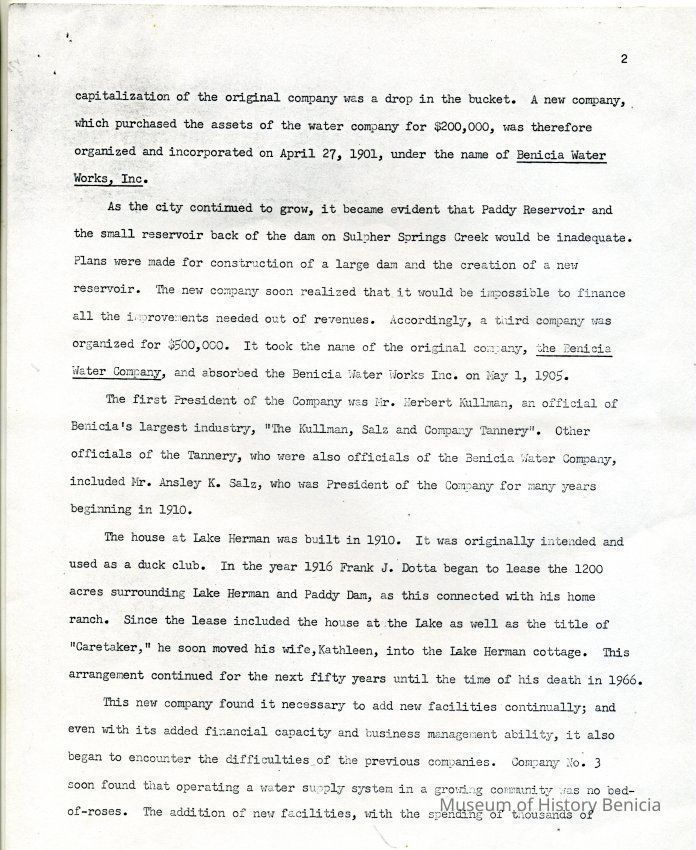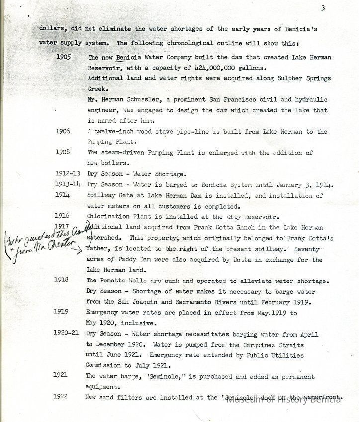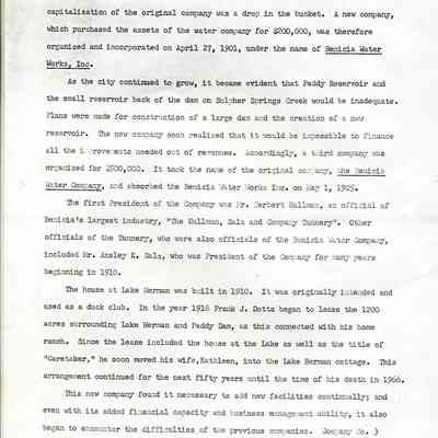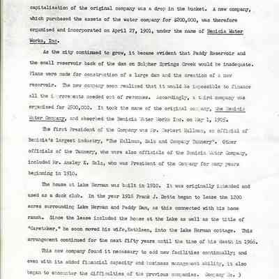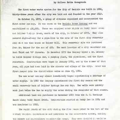 This is an article written by Colleen Dotta Casagranda about the history of Lake Herman. It recaps the water works system in Benicia before Lake Herman was built and then details the building of Paddy Reservoir prior to building Lake Herman. It tells of the several Water companies that were started and then sold as Benicia's population and water demands changed. The last page tells a little about the flora and fauna around Lake Herman.