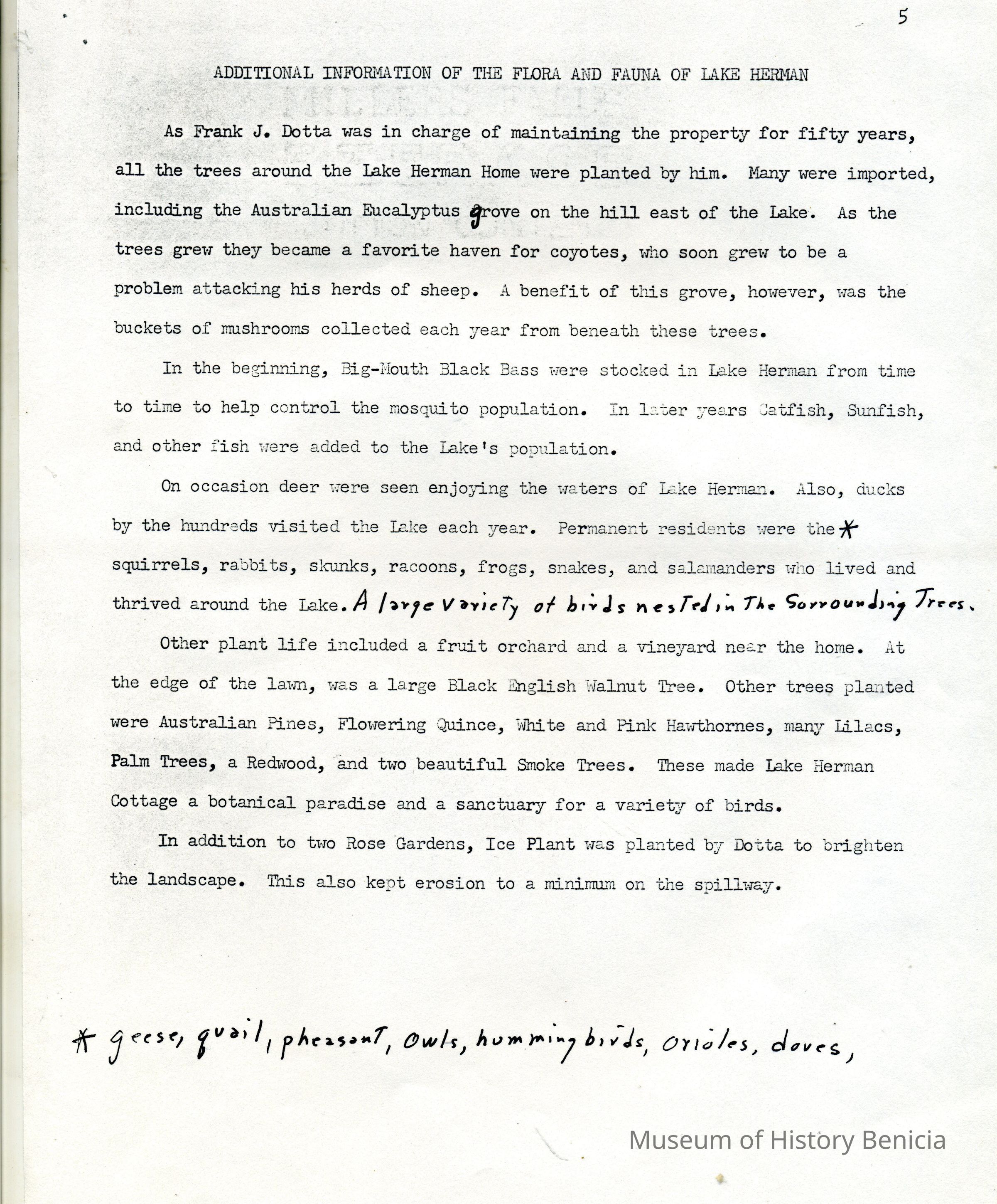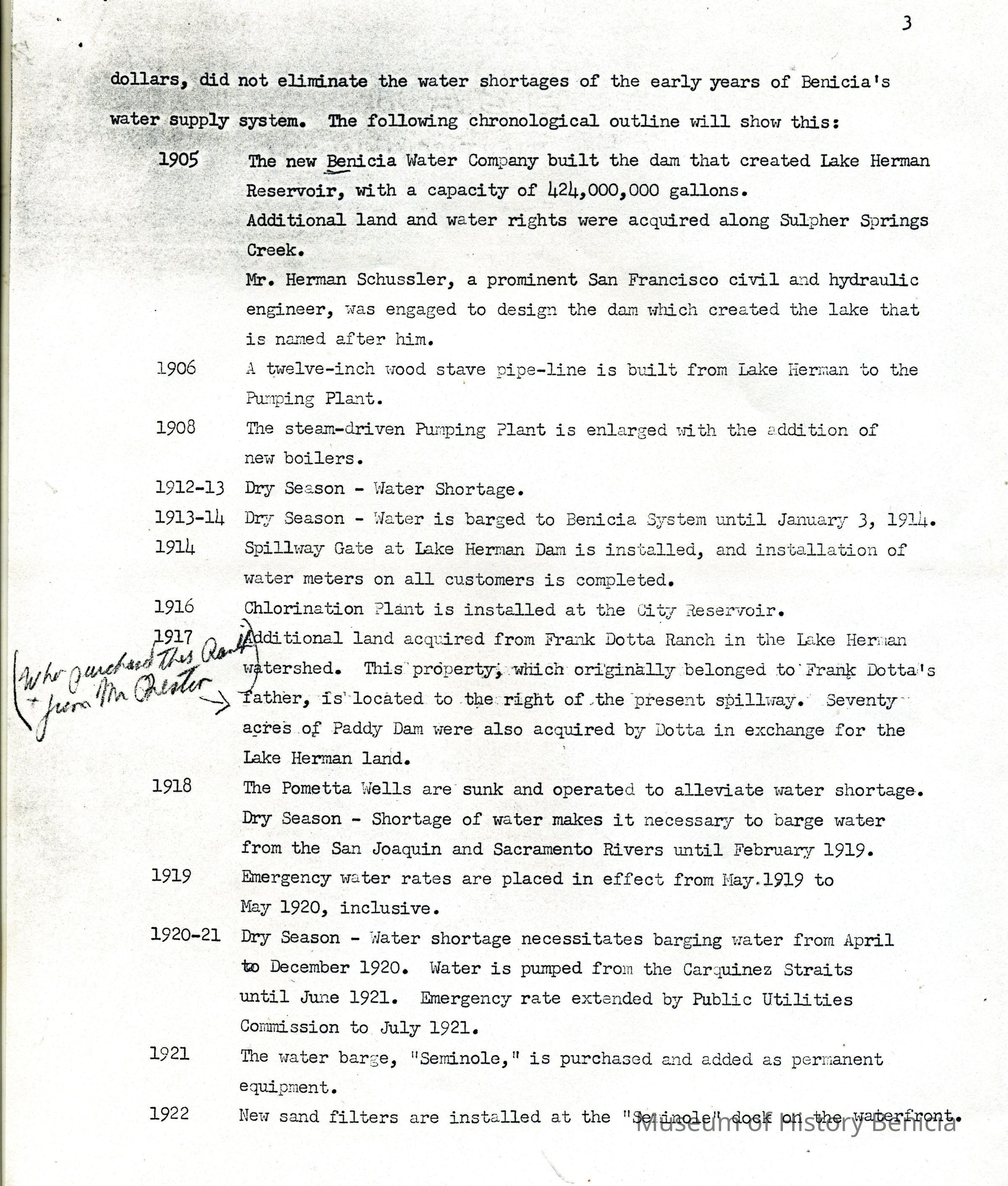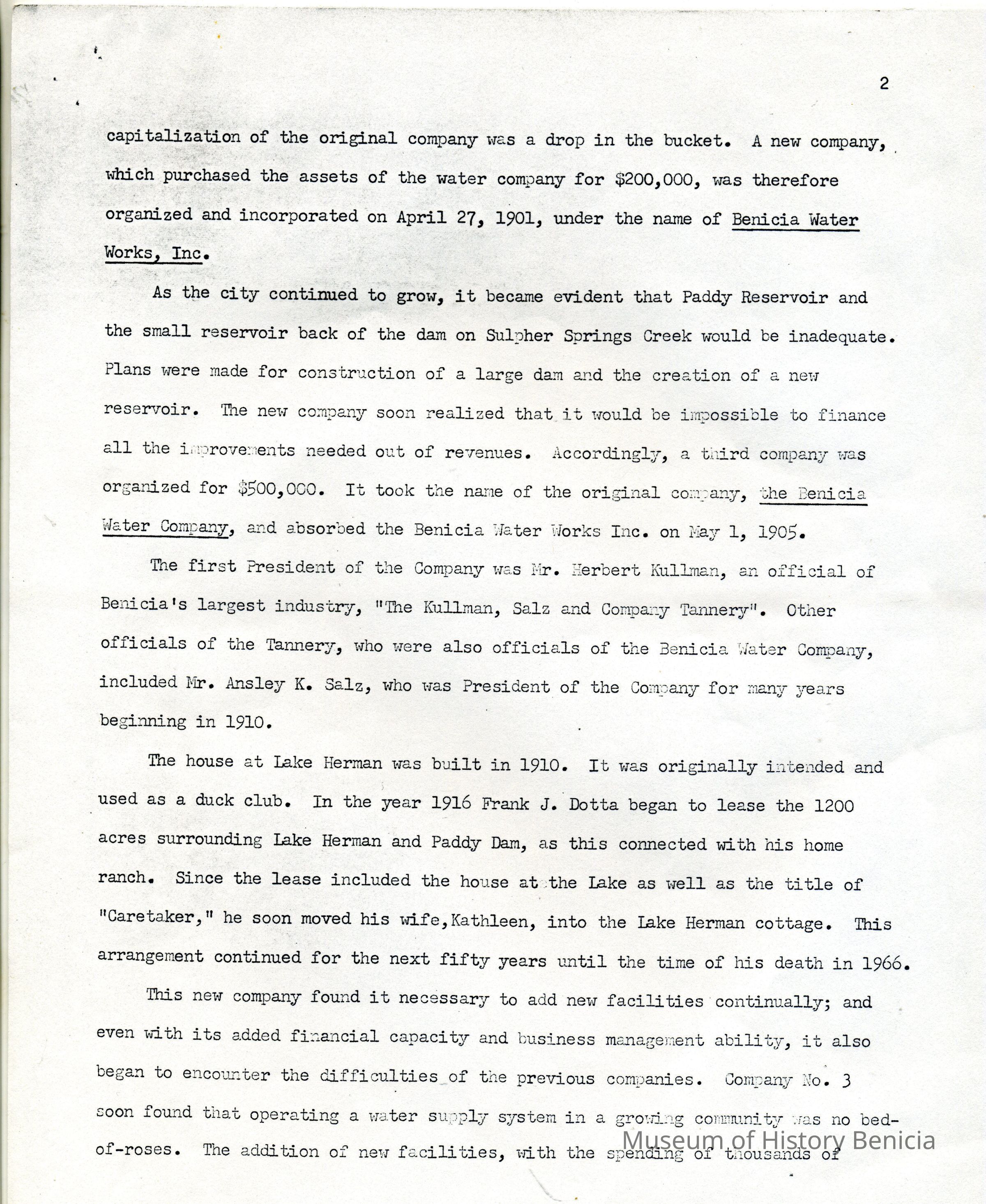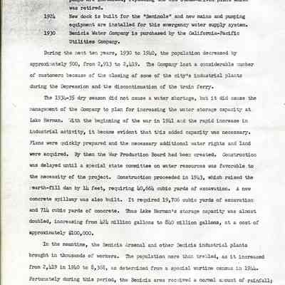 This is an article written by Colleen Dotta Casagranda about the history of Lake Herman. It recaps the water works system in Benicia before Lake Herman was built and then details the building of Paddy Reservoir prior to building Lake Herman. It tells of the several Water companies that were started and then sold as Benicia's population and water demands changed. The last page tells a little about the flora and fauna around Lake Herman.