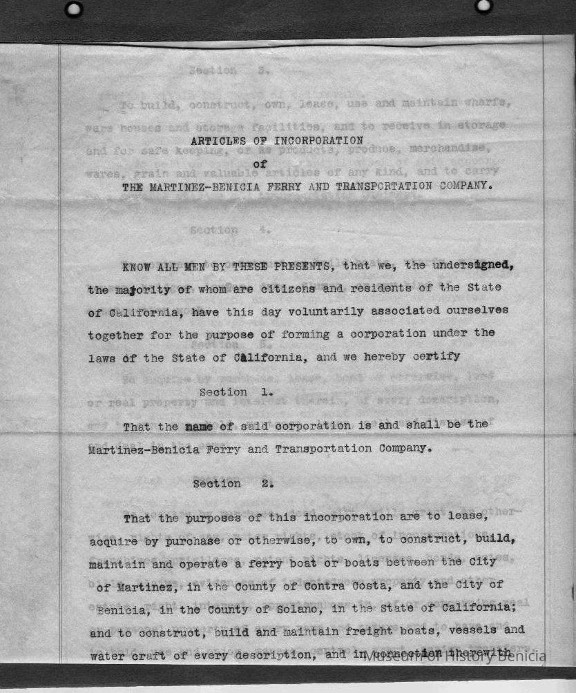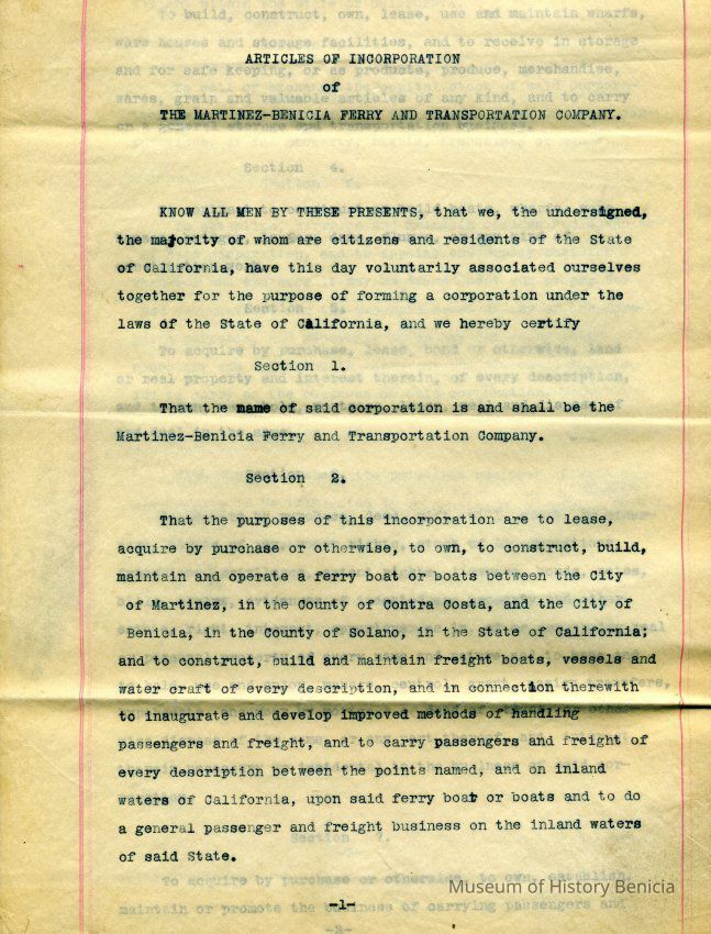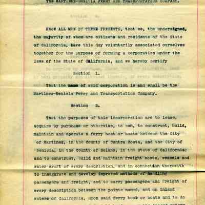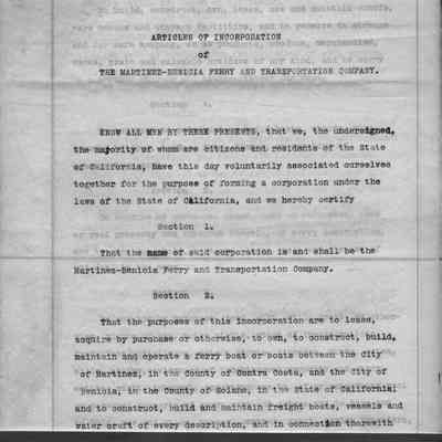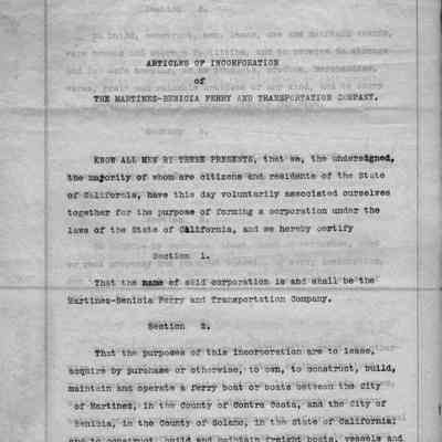 Certified copy of the Articles of Incorporation of the Martinez-Benicia Ferry and Transportation Co. Filed Jan. 15 1912.