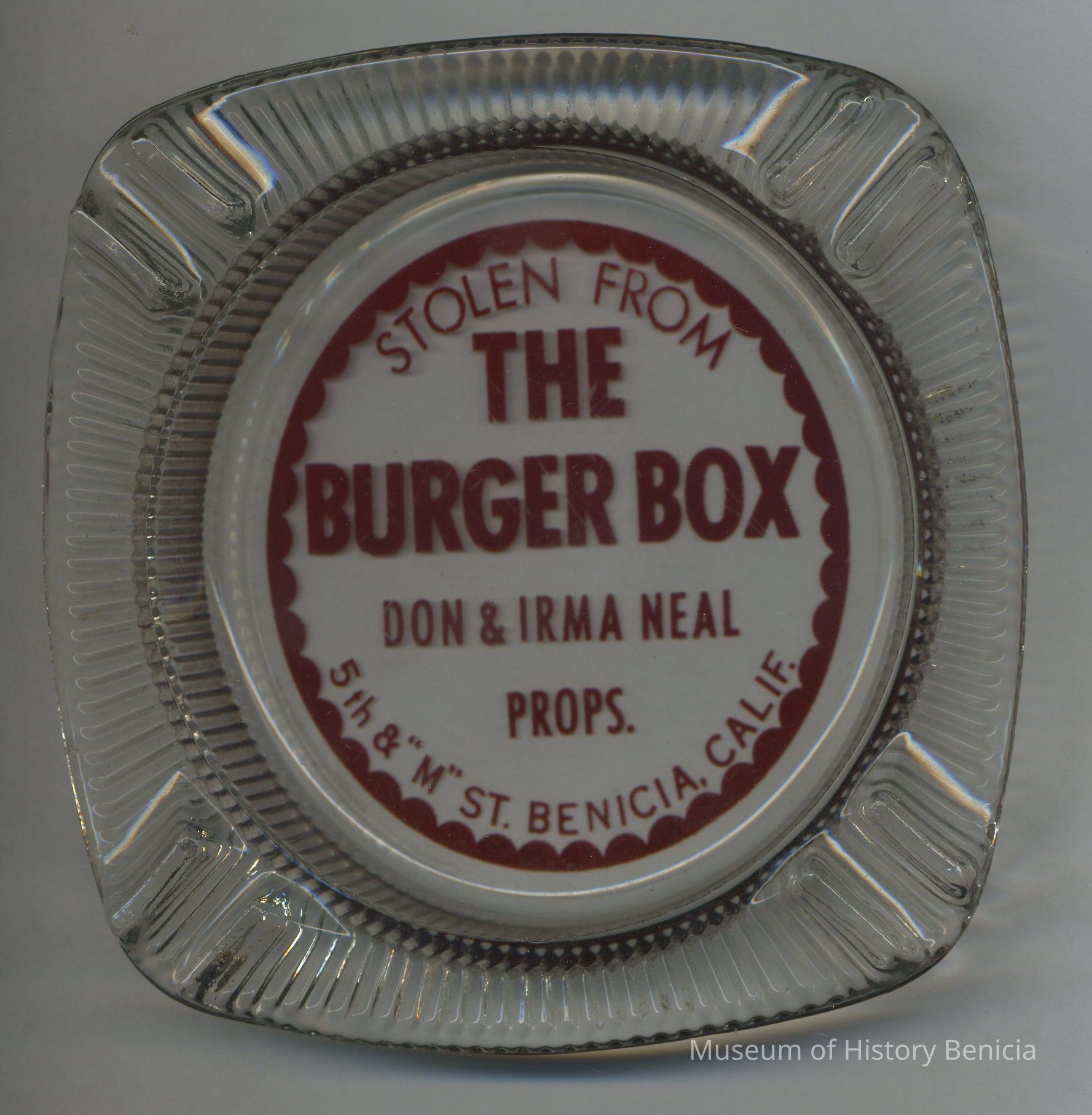 Advertising Ashtray - clear glass, rounded square with ridges around the edge; in center red letter "Stolen From / The Burger Box / Don & Irma Neal Props. / 5th & "M" St. Benicia Calif." red scalloped circle around the lettering. 4-1/8" x 4-1/8" x 3/4".Collection