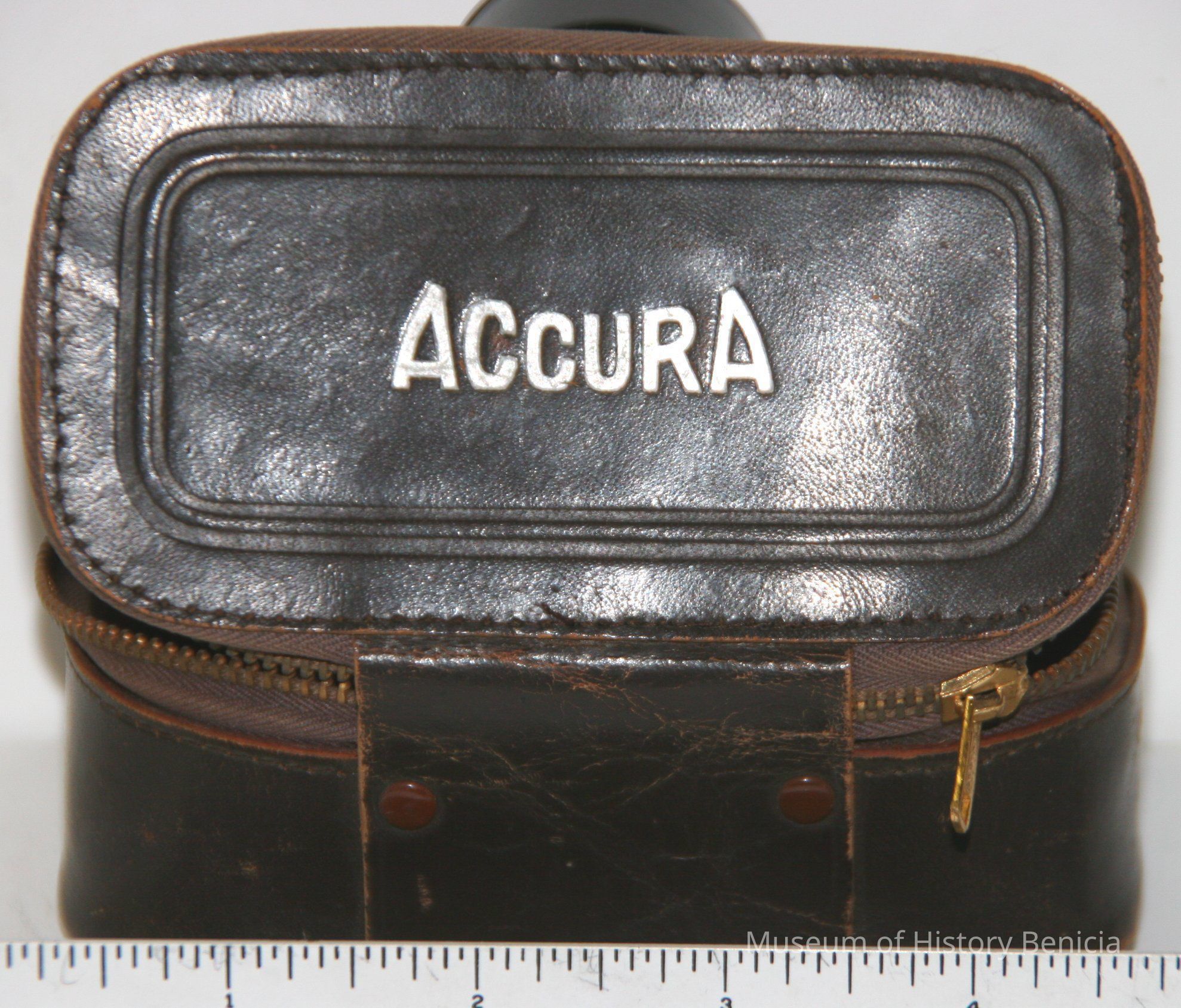 Brown leather case for folded flash attachment and cord. Lined in maroon plush fabric. Accura written on top of case.
