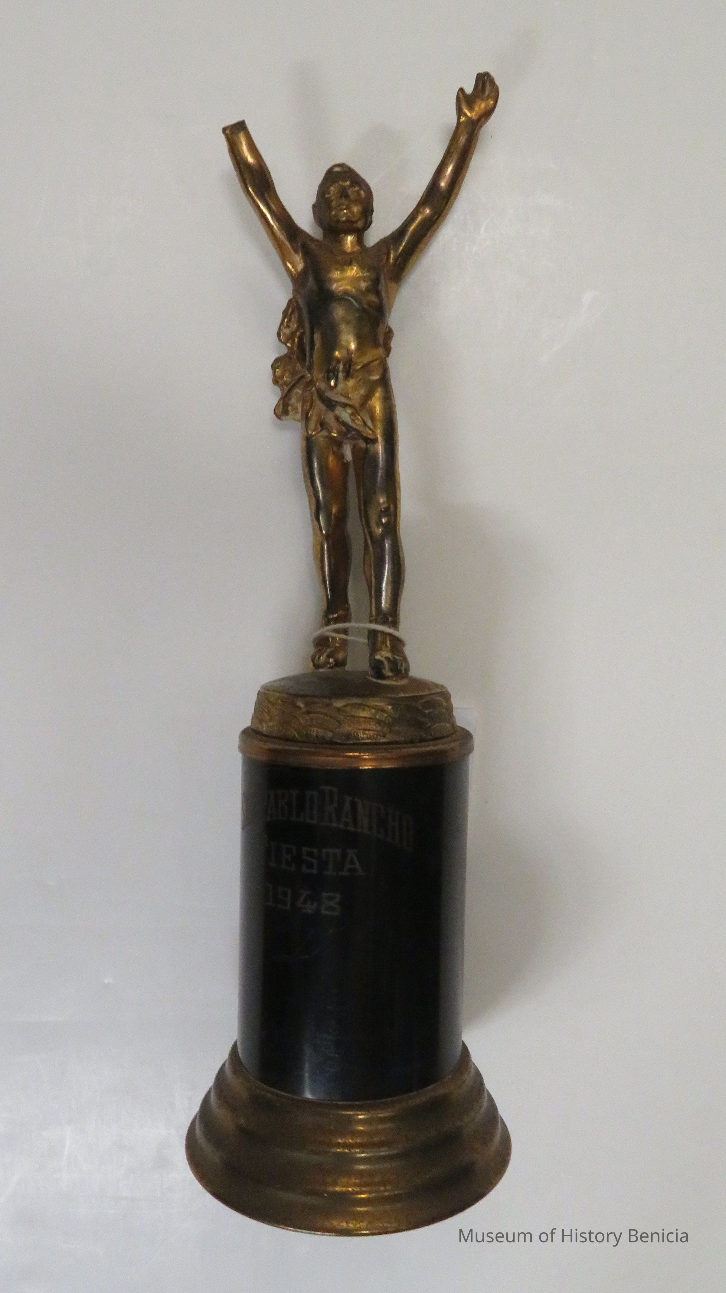 Written on trophy: "San Pablo Rancho-Fiesta-1948" Man with cape and arms up on top of trophy. Granite Bros. Trophies-San Francisco-Oakland-Calif.