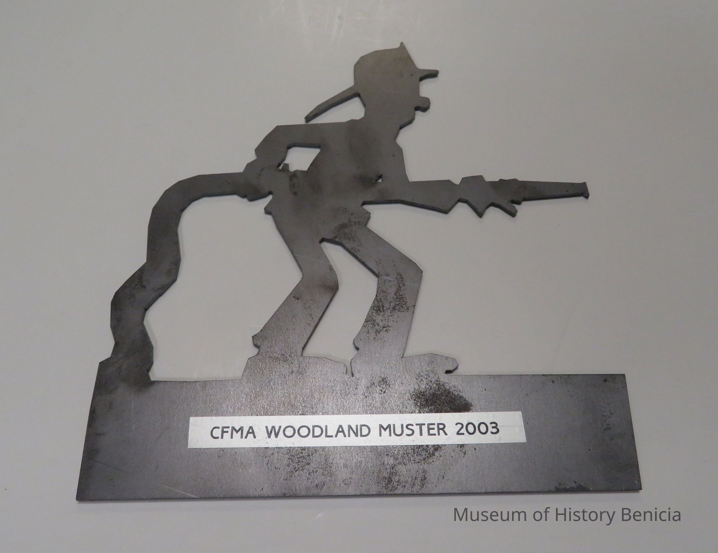 Plat metal piece with fireman holding a hose "CFMA Woodland Muster 2003