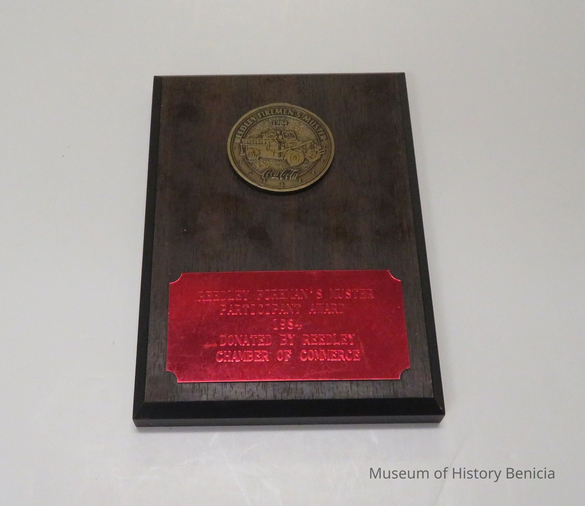 On round medallion: "Reedly Firemen's Muster 1984-Coco Cola On label: "Reedley Rireman's Muster-Participant Awarde 1984-Donated by Reedley Chamber of Commerce."