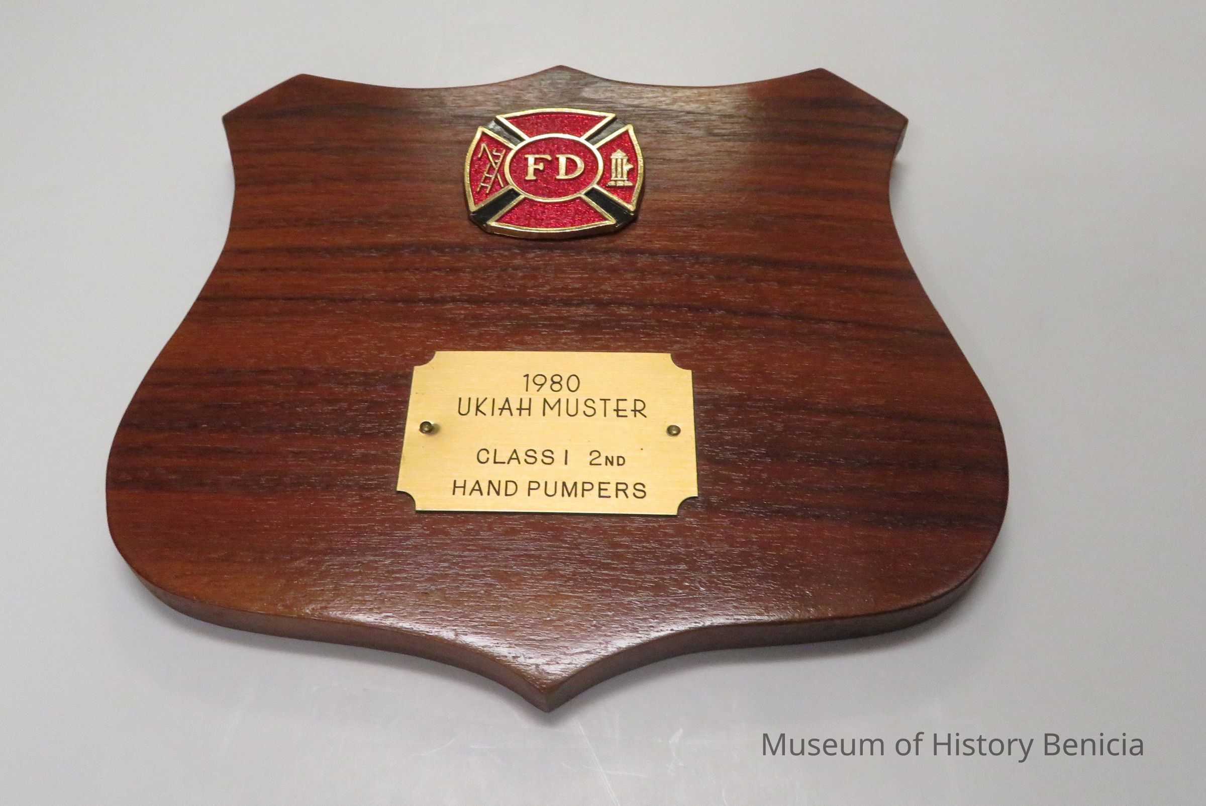 On insignia: "FD" On label: "1980 Ukiah Muster-Class I-2nd Hand Pumpers" On back of plaque: "24-26 May 1980-Phoenix No. 2-118' 9"