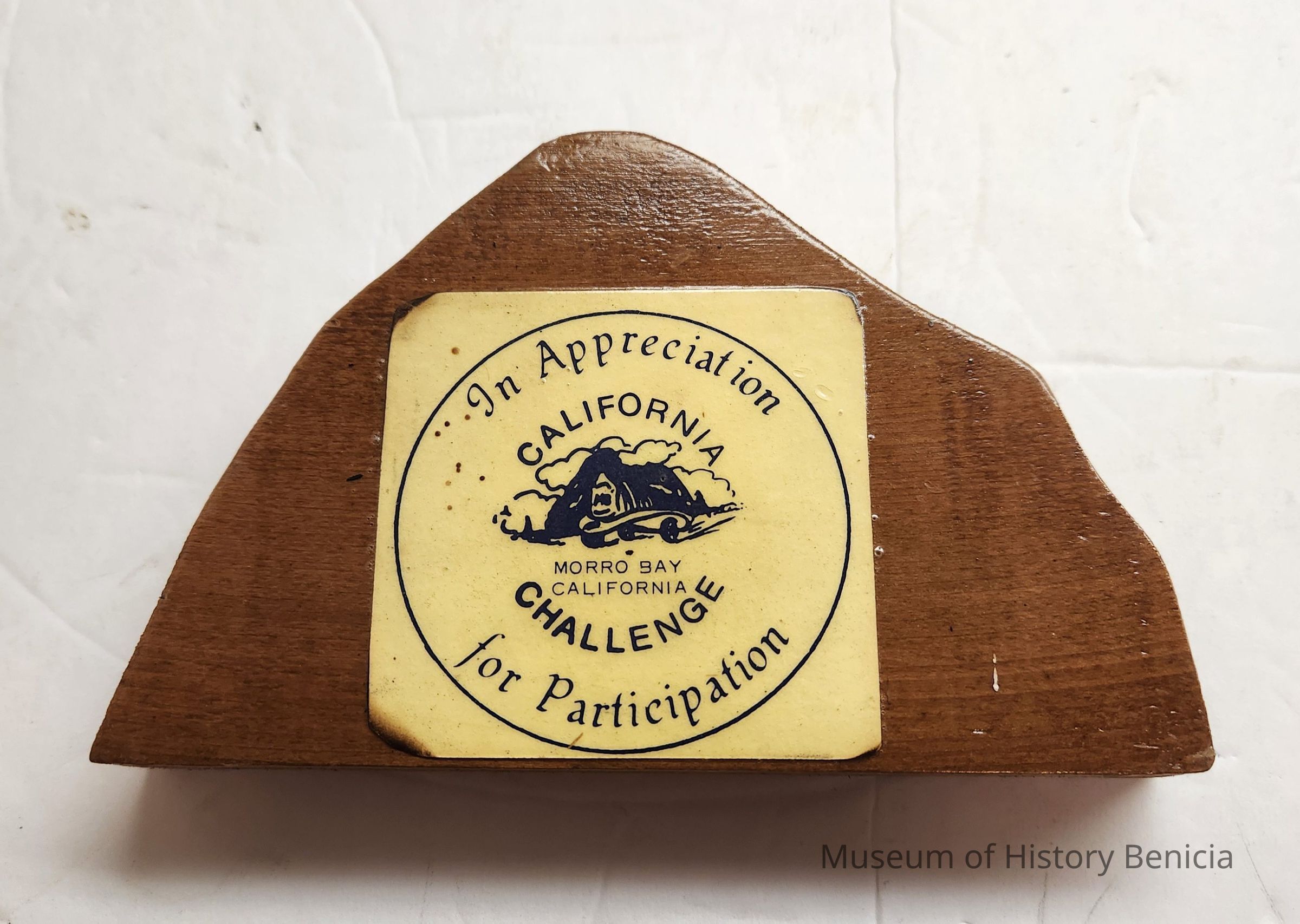 Wood with cream colored label; the shape is triangle-ish
