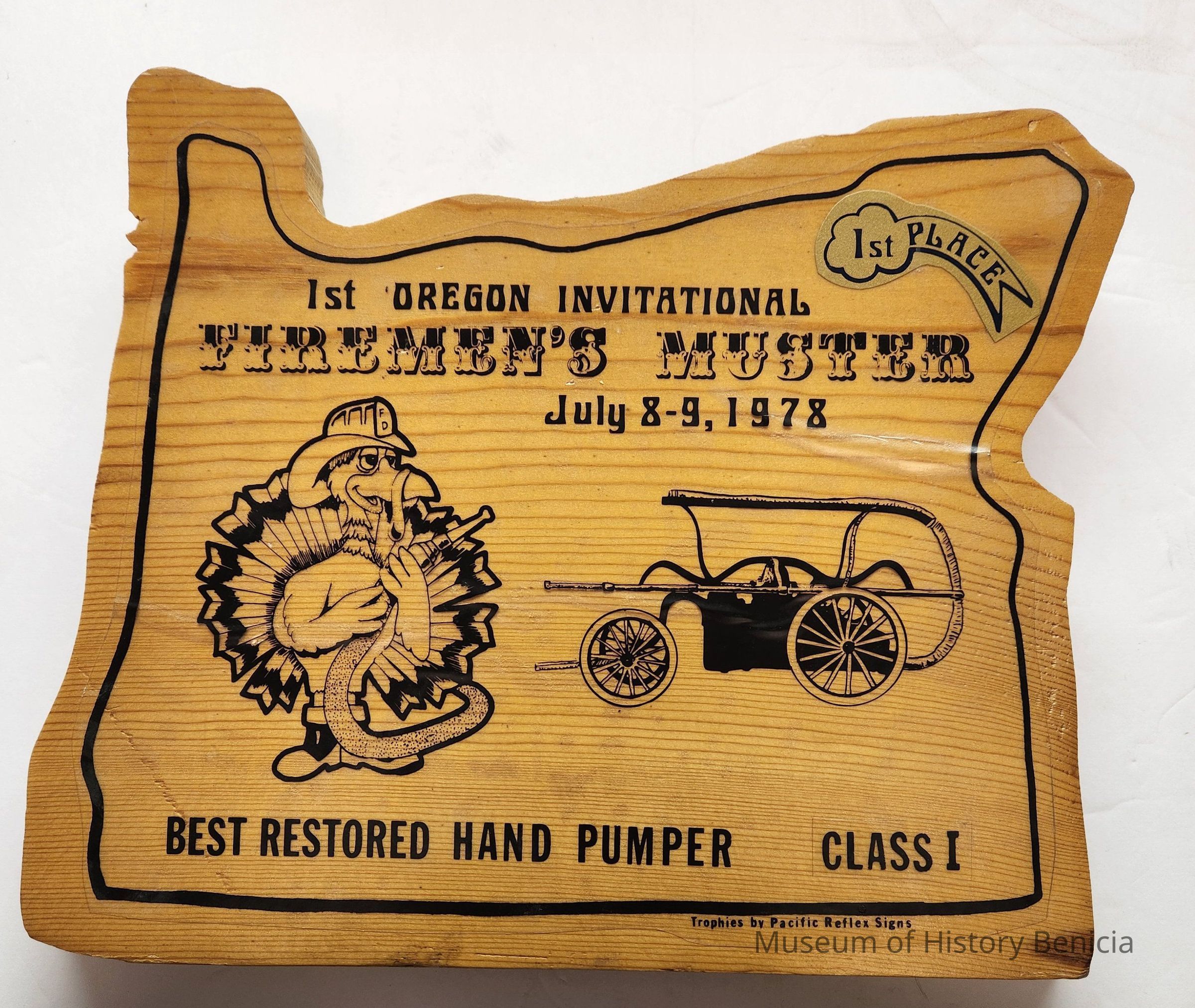 Wood plaque in the shape of the state of Oregon 1st Oregon Invitational Firemen's Muster July 8-9, 1978 First Place Best Restored Hand Pumper Class I