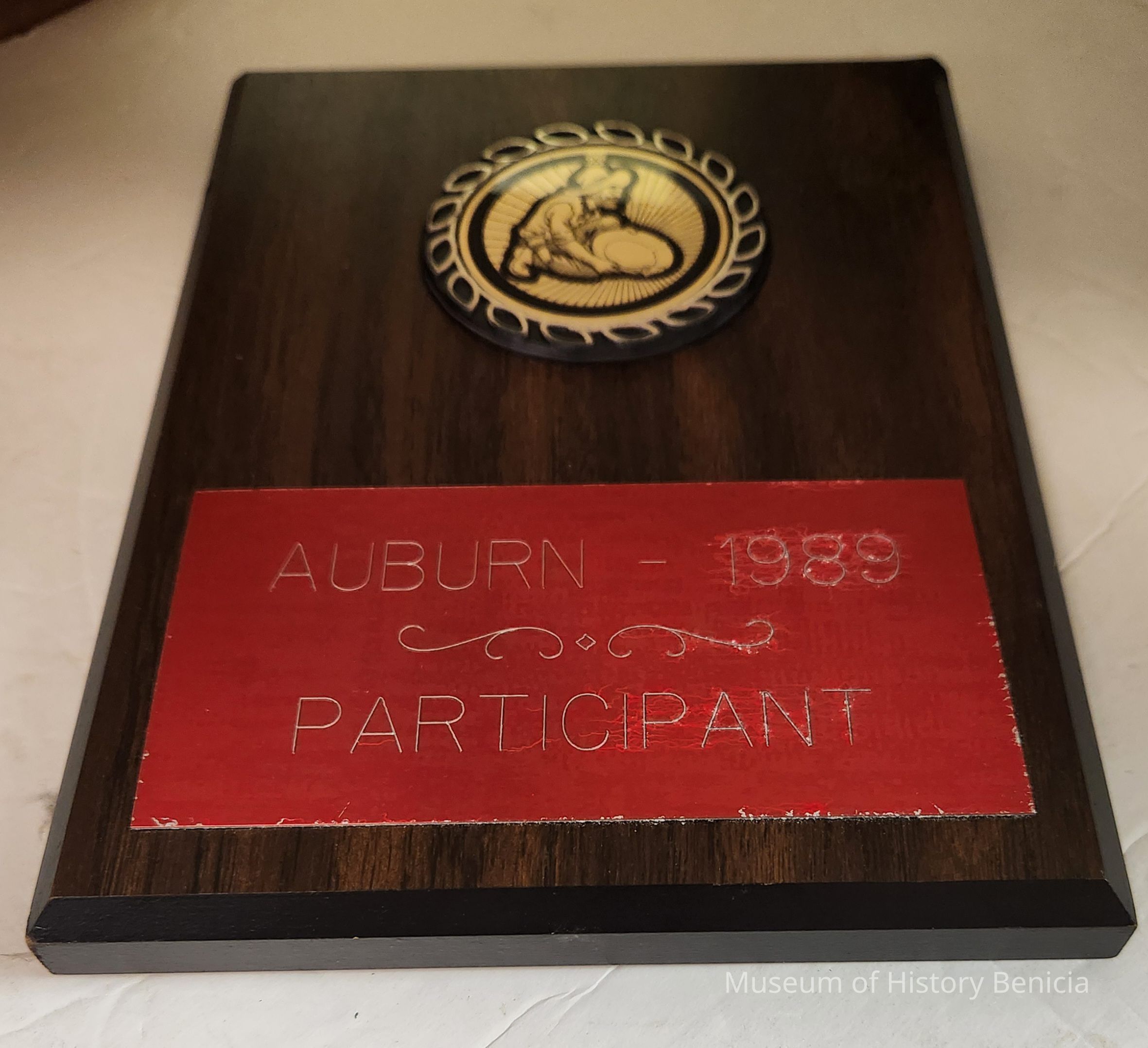 Wood plaque with round gold panner decoration and red label
