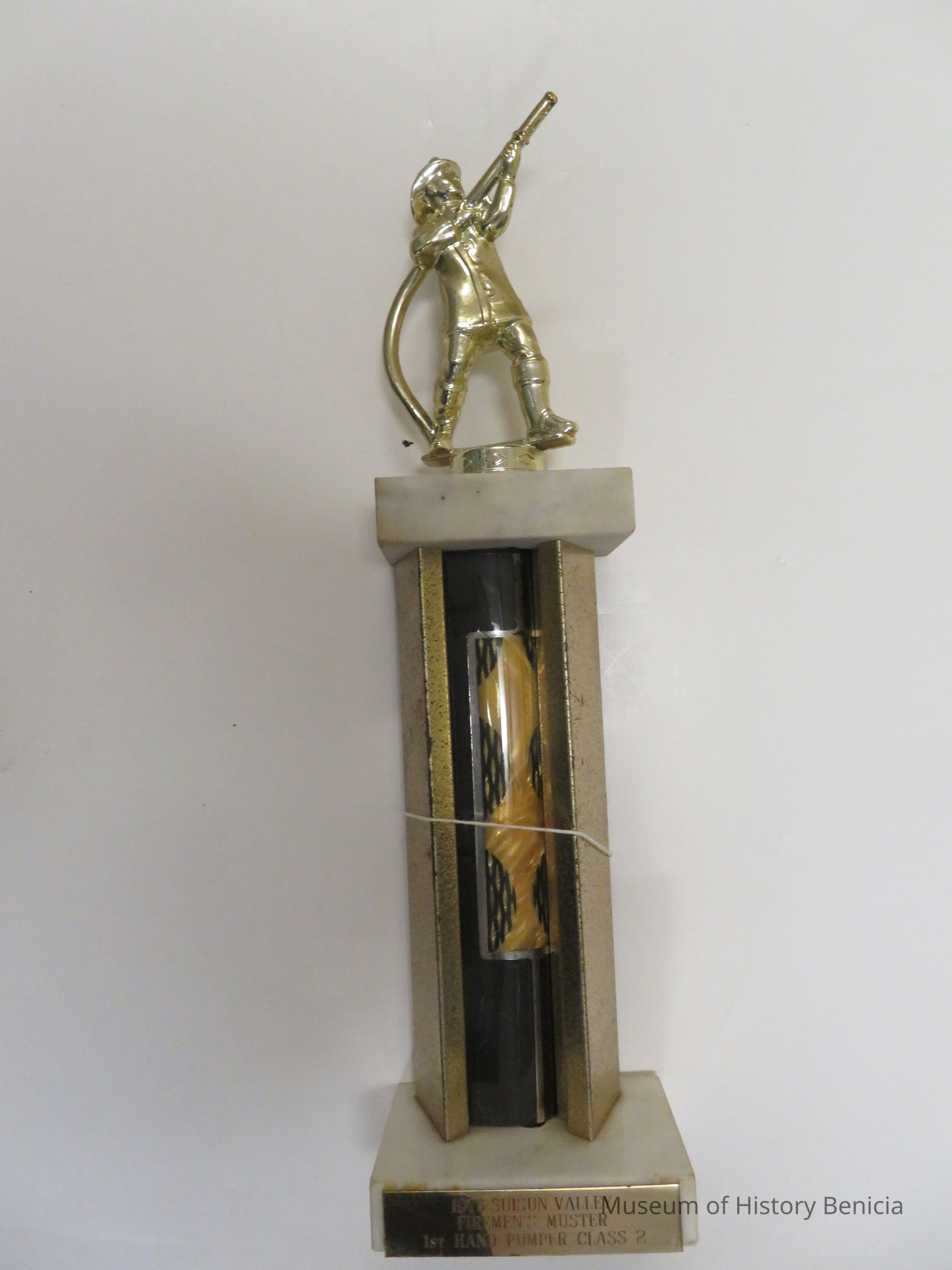 On trophy is a gold fireman holding a hose. On label, "1975 Suisun Valley Fireman's Muster 1st Handpumper Class 2".