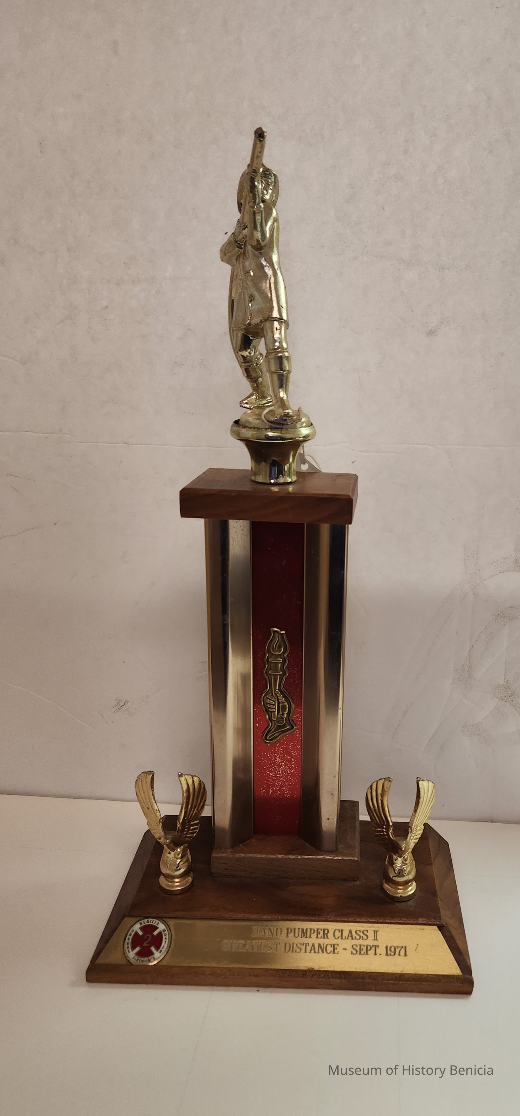 Trophy wood and brass, fireman with hose on top; two winged eagles on base; hand holding a torch on front center column;