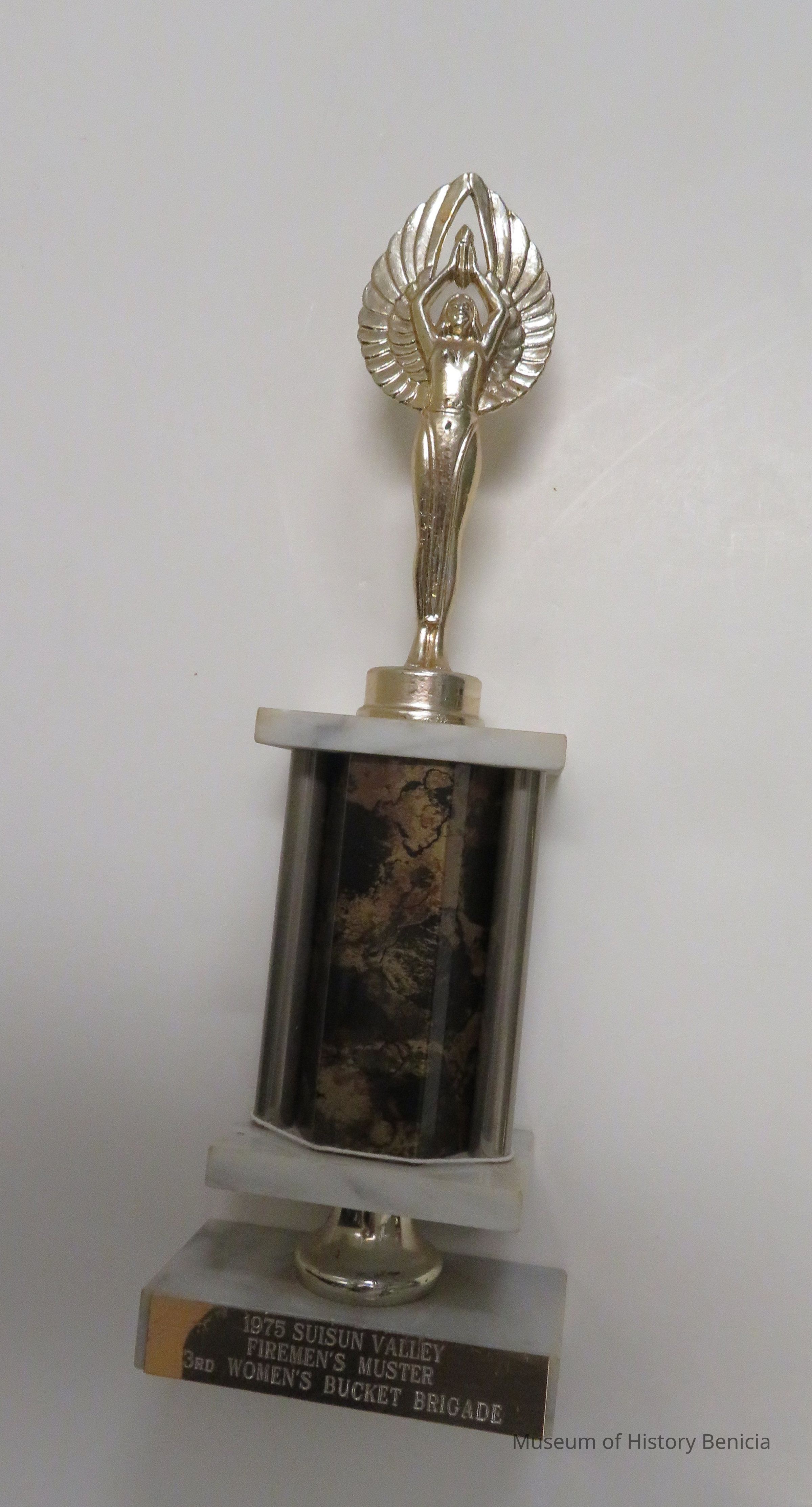 1975 Suisun Valley Firemen's Muster 3rd Women's Bucket Brigade on inscribed on bottom plate. Marble base with gold plaque, middle section of marble-like design, topped with gold painted lady wearing wings.Collection