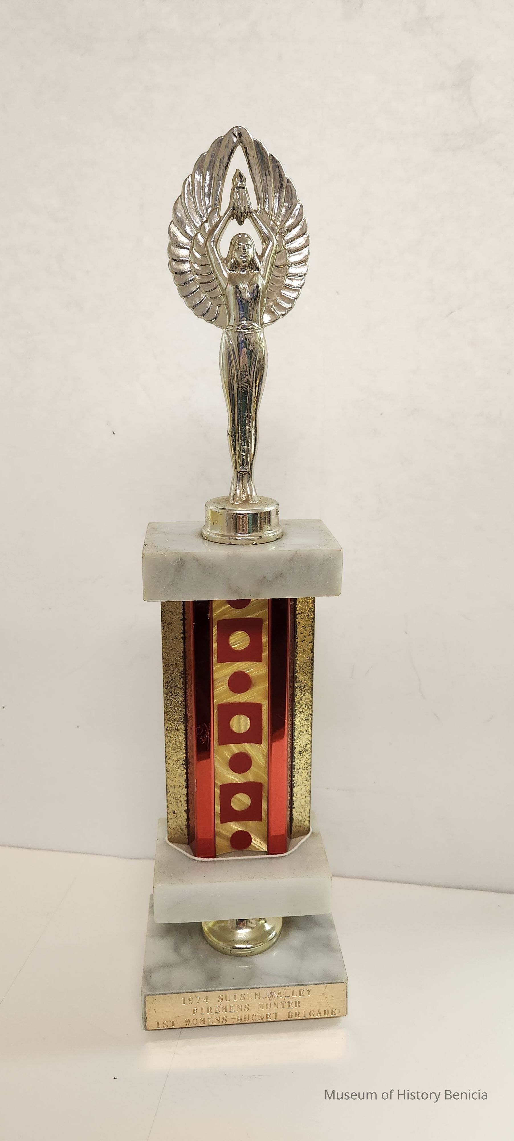 Trophy of metal, plastic and marble with Winged Victory on top level; center section is red and gold;