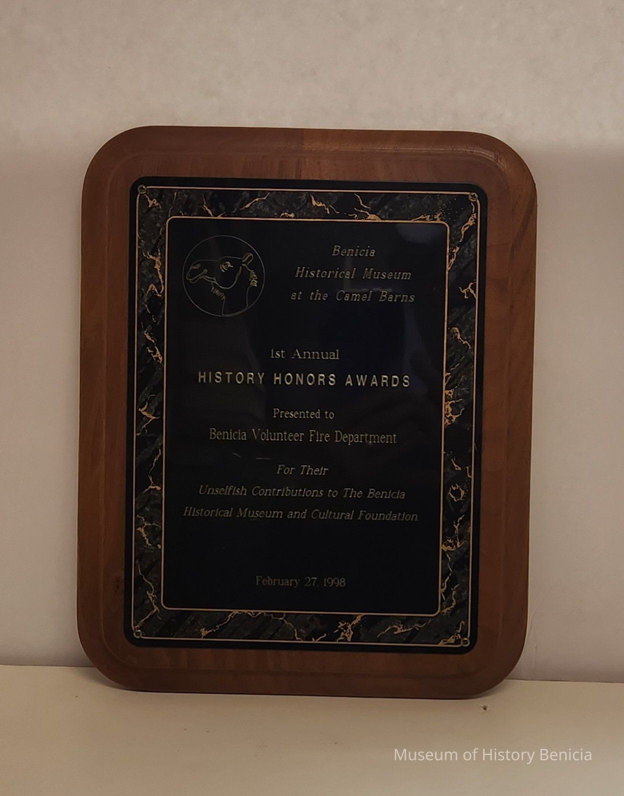 Benicia Historical Museum at the Camel Barns / 1st Annual / History Honors Awards / presented to / Benicia Volunteer Fire Department / For Their / Unselfish Contributons to the Benicia / Historical Museum and Cultural Foundation / February 27, 1998.