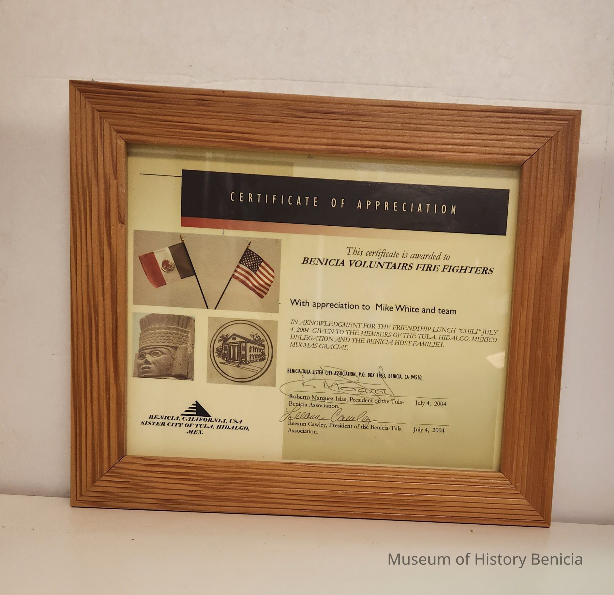 This certificate is awarded to Benicia Voluntairs Fire Fighters