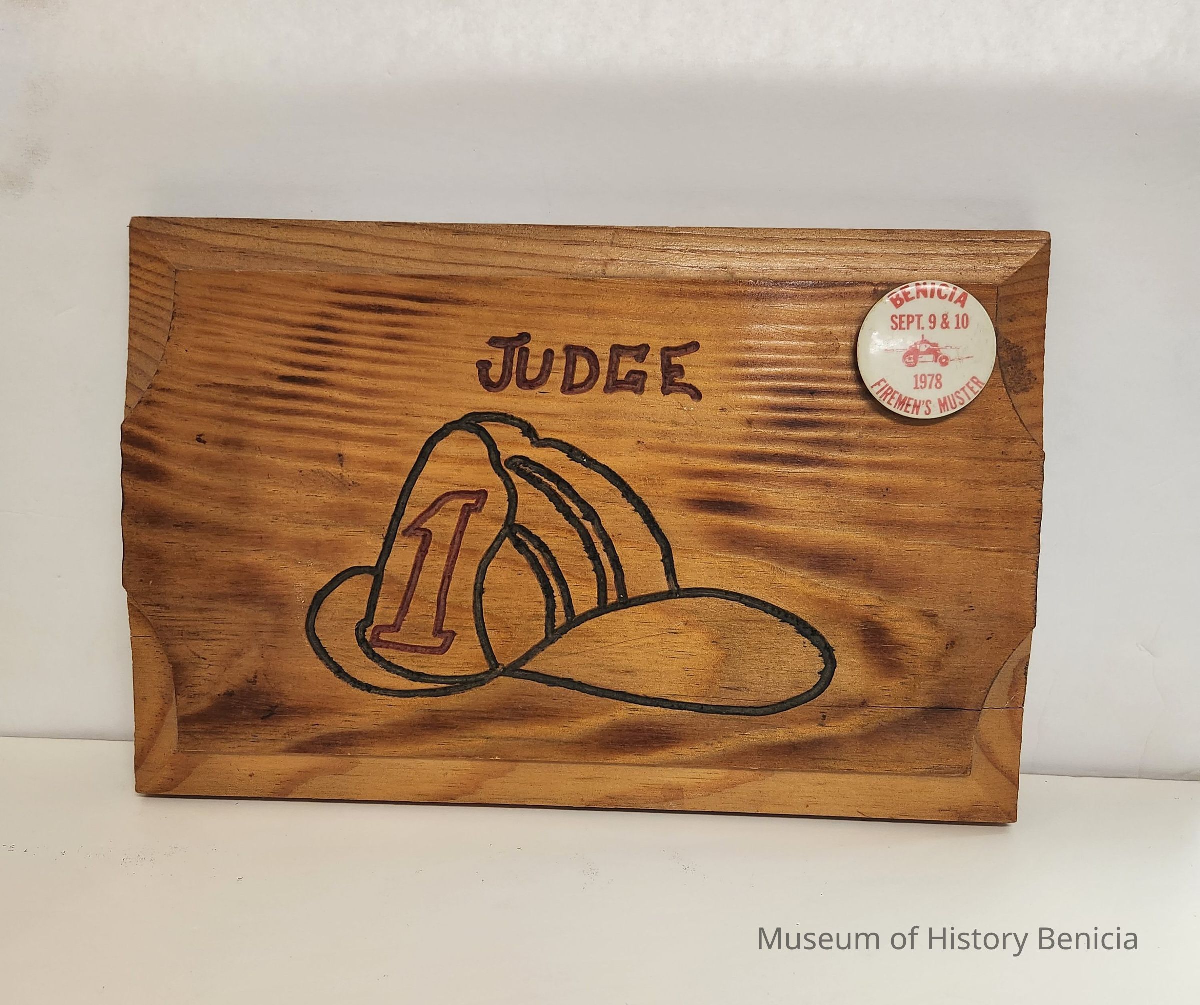 Wood plaque with a badge on the top right. The word Judge and a picture of a fireman's hat with #1 on it are burnt into the plaque.