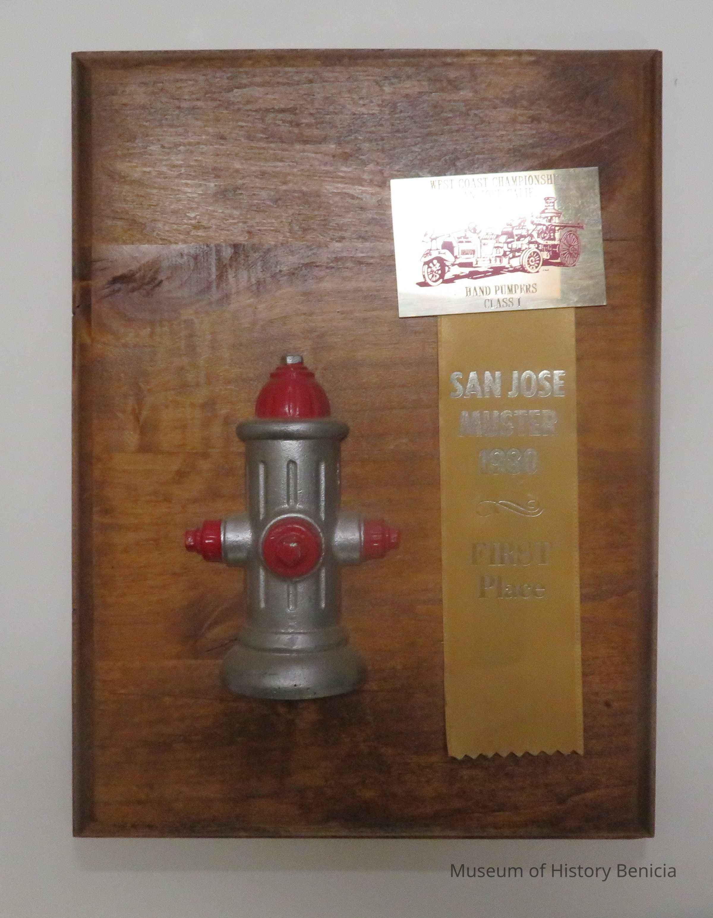 On the ribbon is written San Jose Muster 1980, First Place. The plaque reads West Coast Championship, San Jose, Calif. 1980, Hand Pumpers Class 1.Collection
