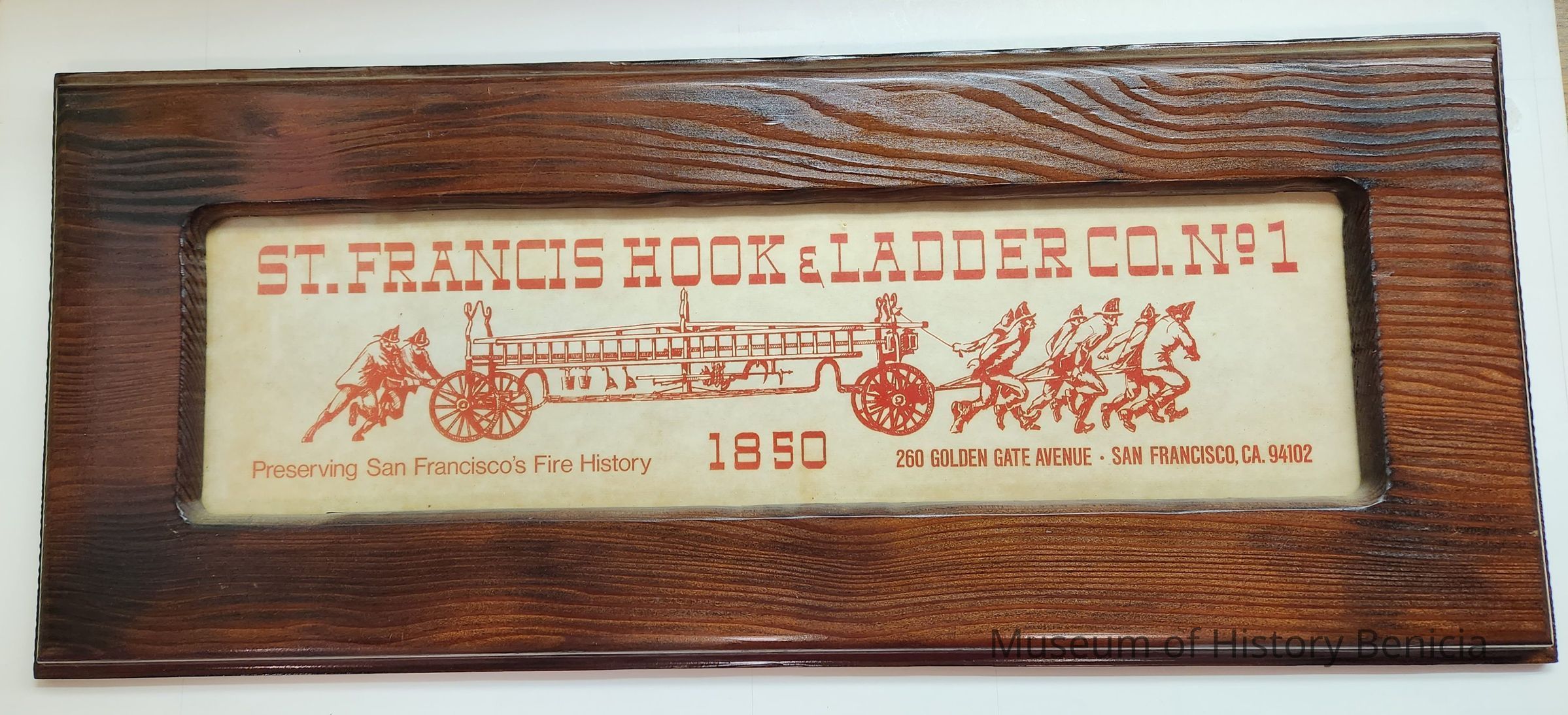 Fire company logo framed in dark wood under glass; a souvenir likely obtained after participation in a muster in San Francisco;