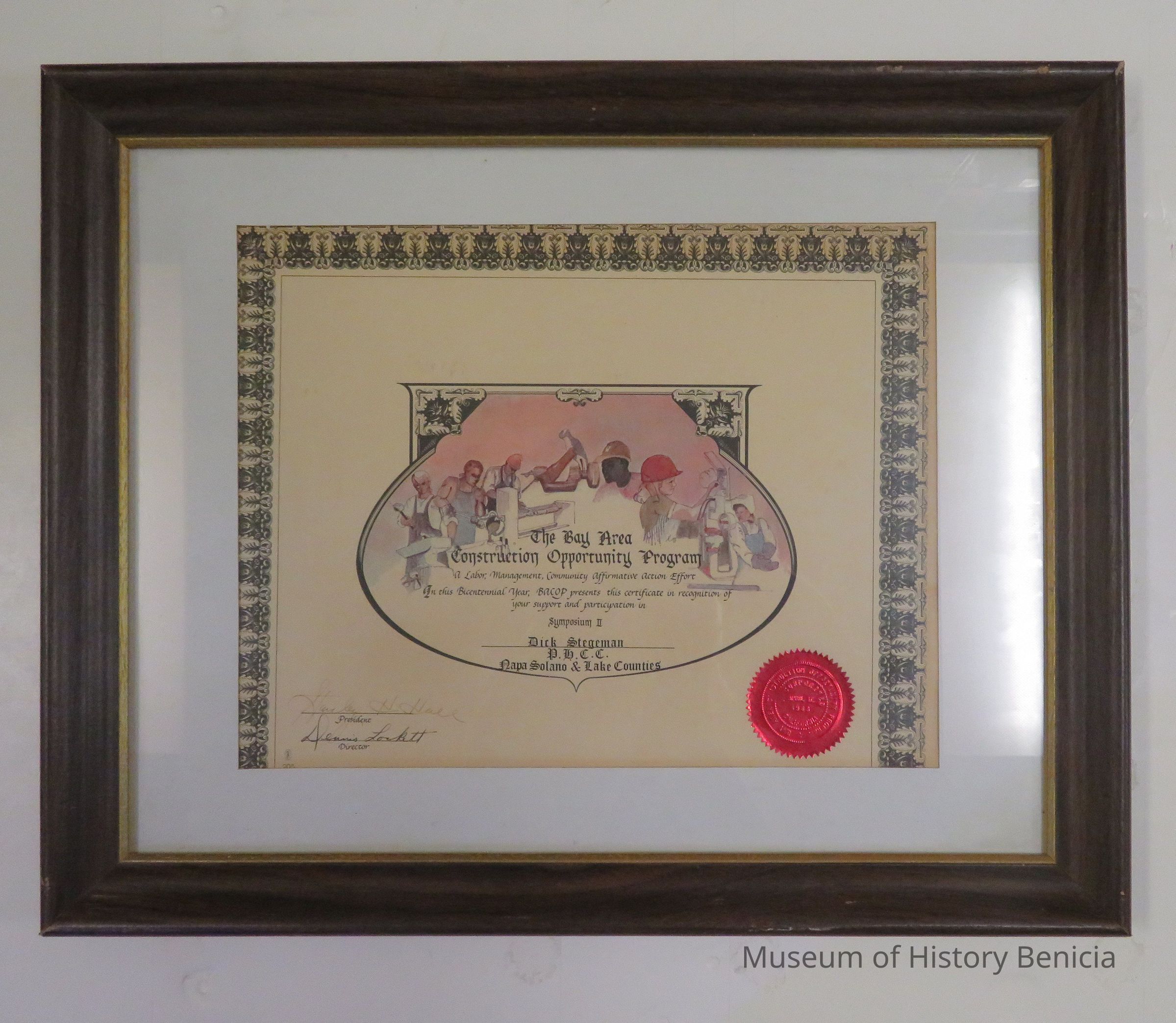 Framed certificate. Wording is "The Bay Area Construction Opportunity Program, a labor, management, community affirmative action effort. In this bicentennial year, BACOP presents this certificate in recognition of your support and participation in Symposium II. Dick Stegeman, Napa Solano and Lake Counties." It has a red award sticker in the lower right hand corner. Signed by Stanley H. Hall (President) and Dennis Lockett (Director).Collection