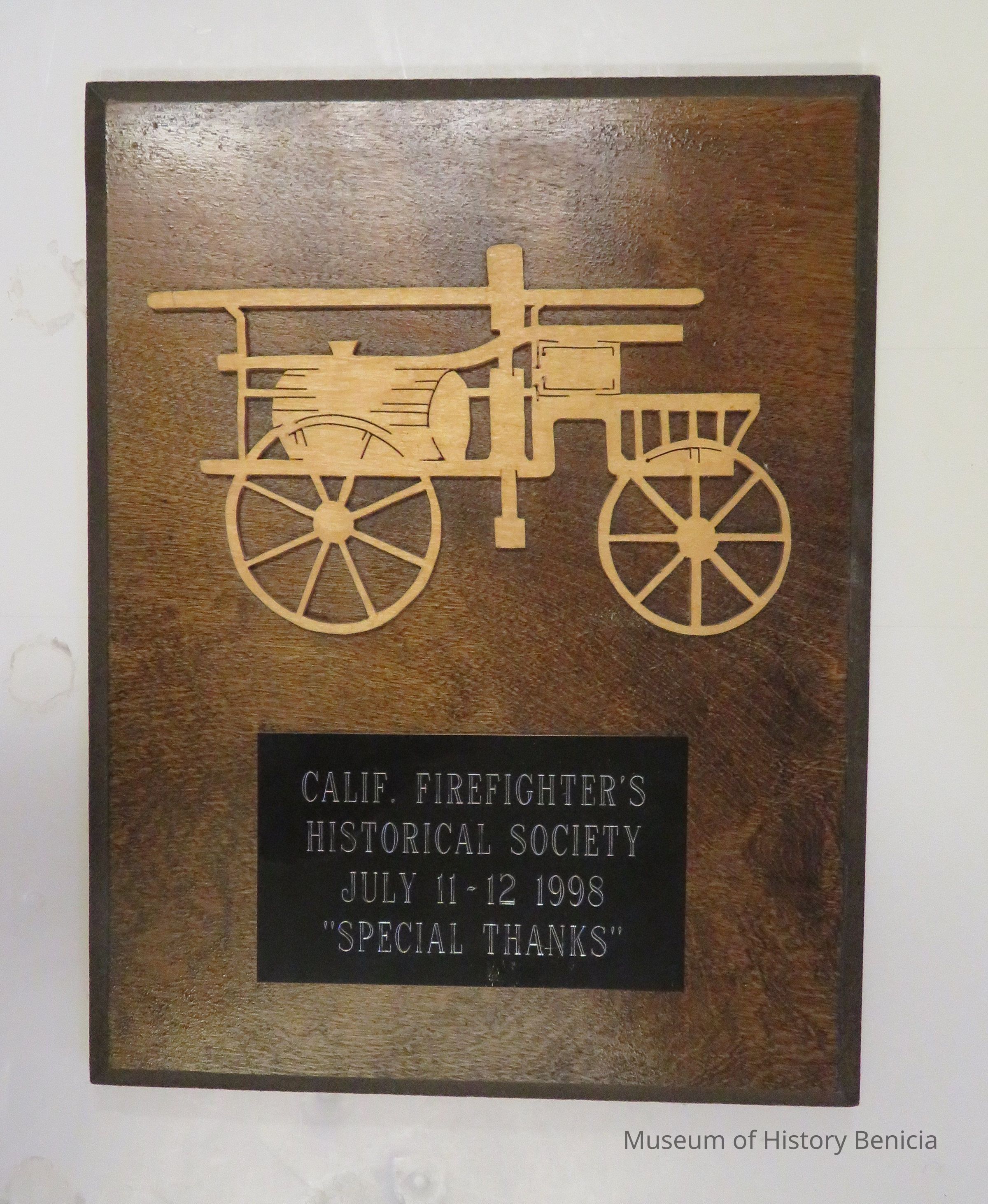 California Firefighter's Historical Society July 11-12 1998 "Special Thanks" wooden plaque. Above the wording is a wood carved pumper truck.