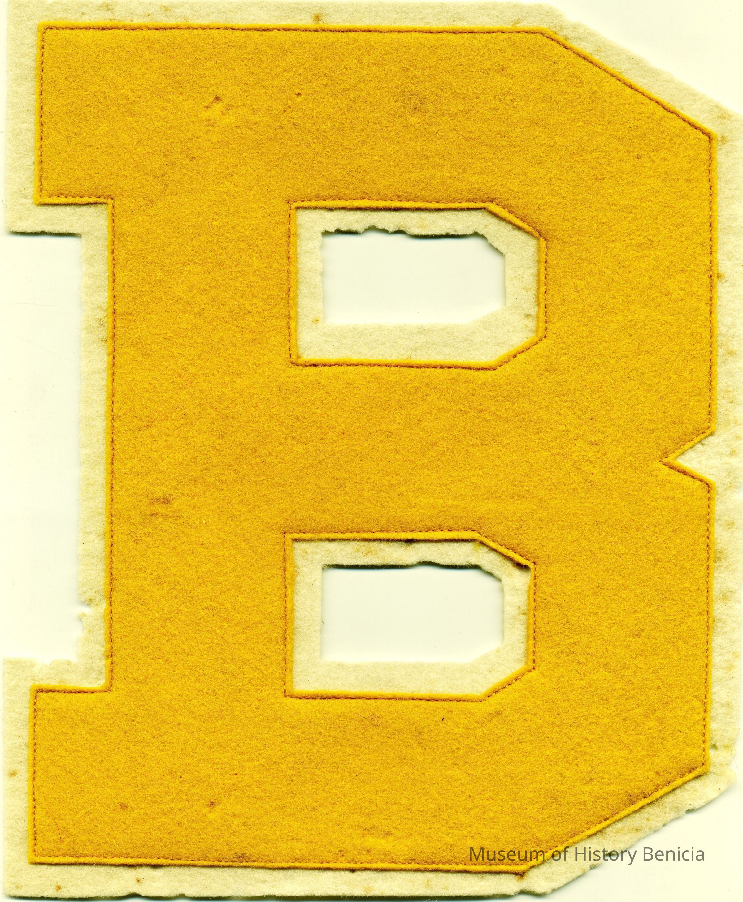 This is a school letter award for Benicia High School. It is a letter "B" on felt cloth. It is yellow in color and about 8" by 6.5" in size. It was made by the Wheeler Mfg. Co of Berkeley, CA.Collection