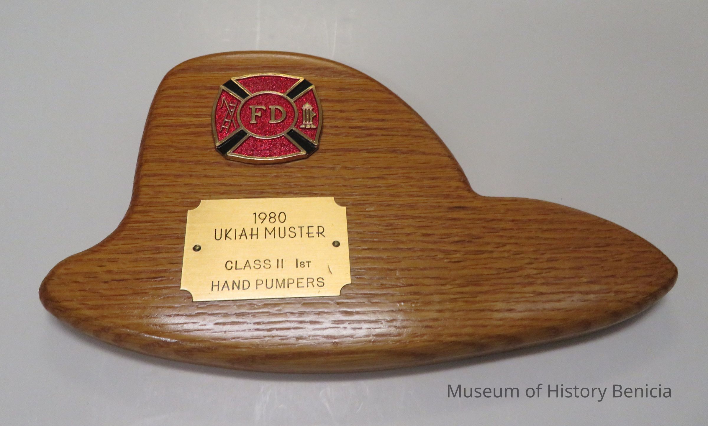 On board shaped like a fireman's helmut: "1980-Ukiah Muster-Class I(I lst Hand Pumpers" On back of board "Ukiah 1980-24-26 May-Benicia, CA-Solano Engine No 1 141'6"