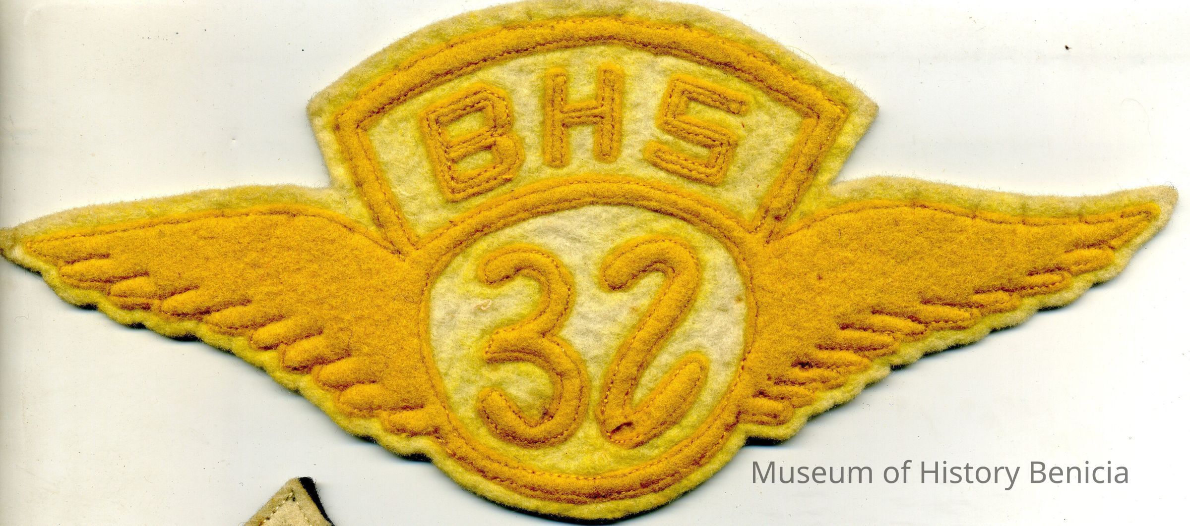 This is a school letter award for Benicia High School. It is a "BHS" with wings above the number 32 on felt cloth. It is yellow in color and about 6.25" in diameter.Collection