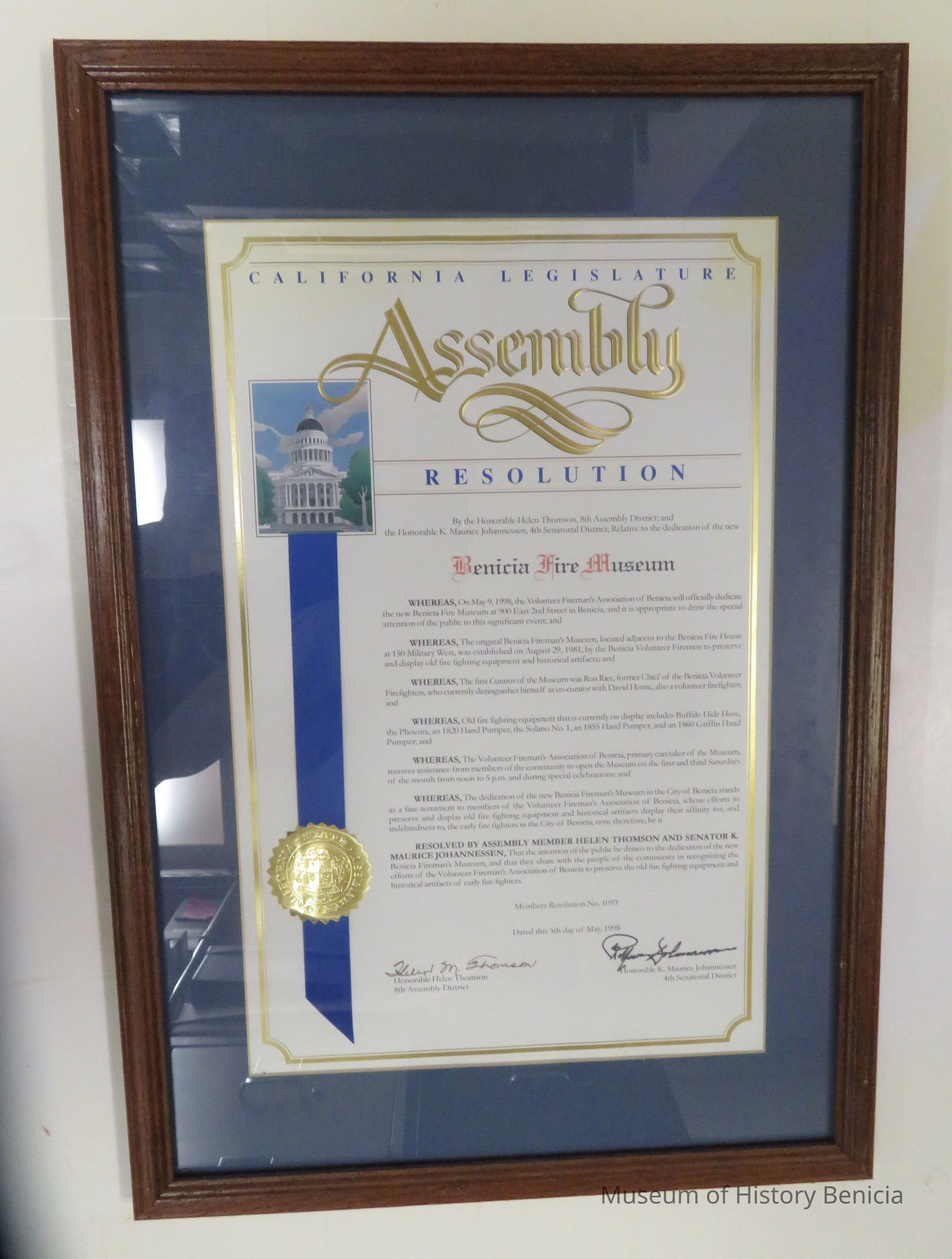 California Legislative Assembly Resolution to the dedication of the Benicia Fire Museum. It is dated on May 5, 1998.