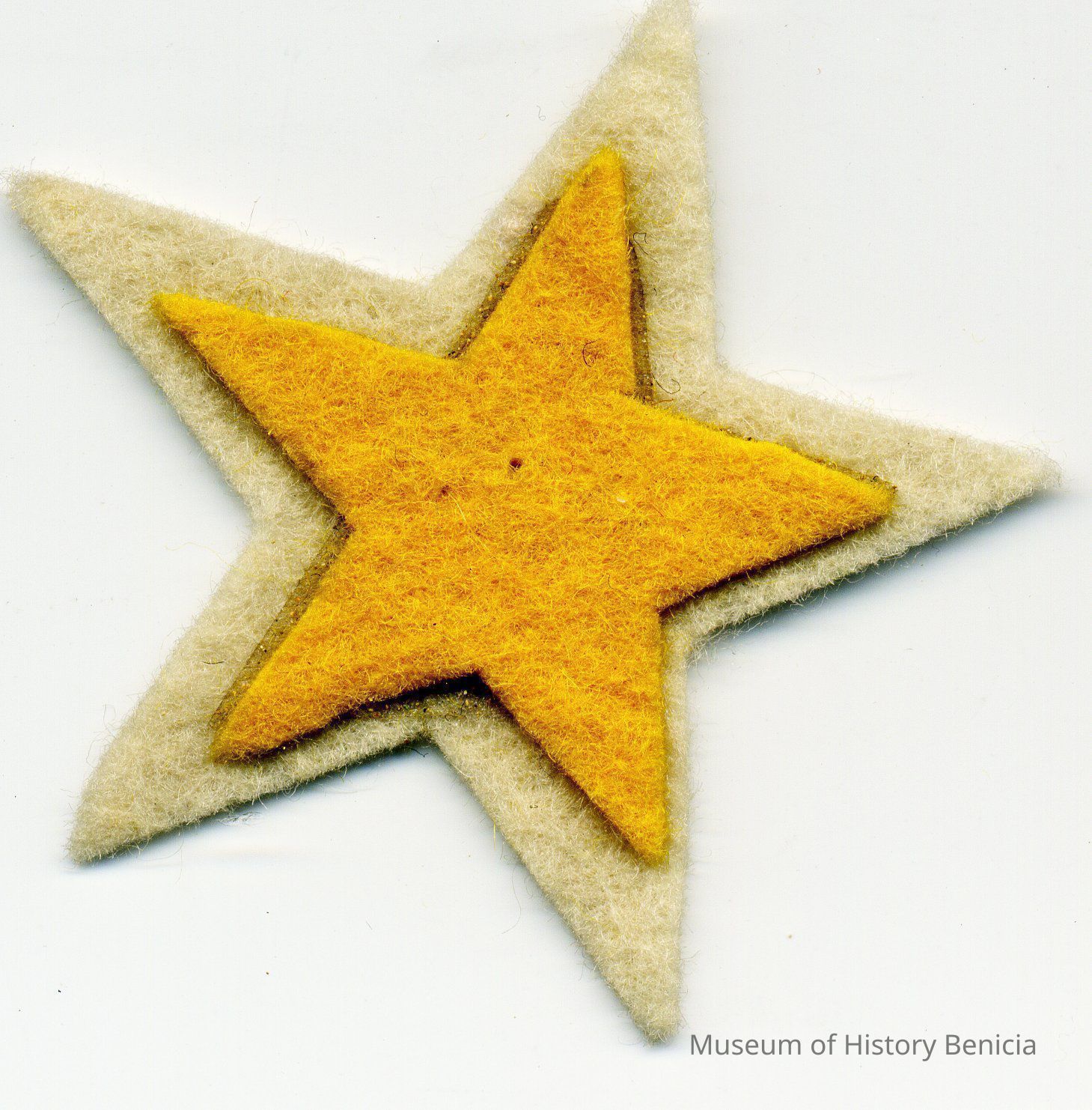 This is a school patch for Benicia High School athletics. It is a star on felt cloth. It is yellow in color and about 1.5 inches in width.