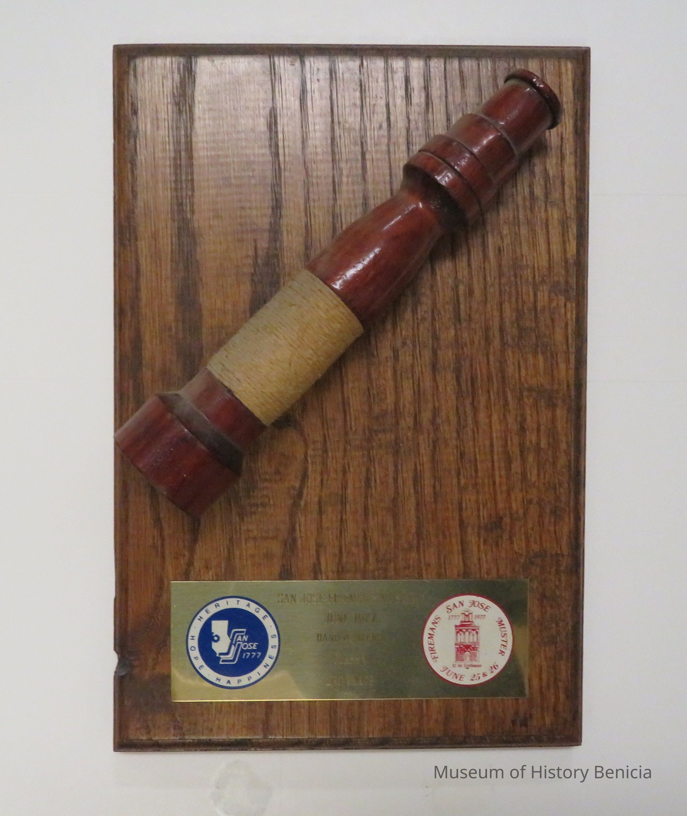 Wood plaque with wooden hose nozzle and gold metal plaque inscribed with "San Jose Firemen's Muster, June 1977, Hand Pumpers, Class 1, 2nd Place."