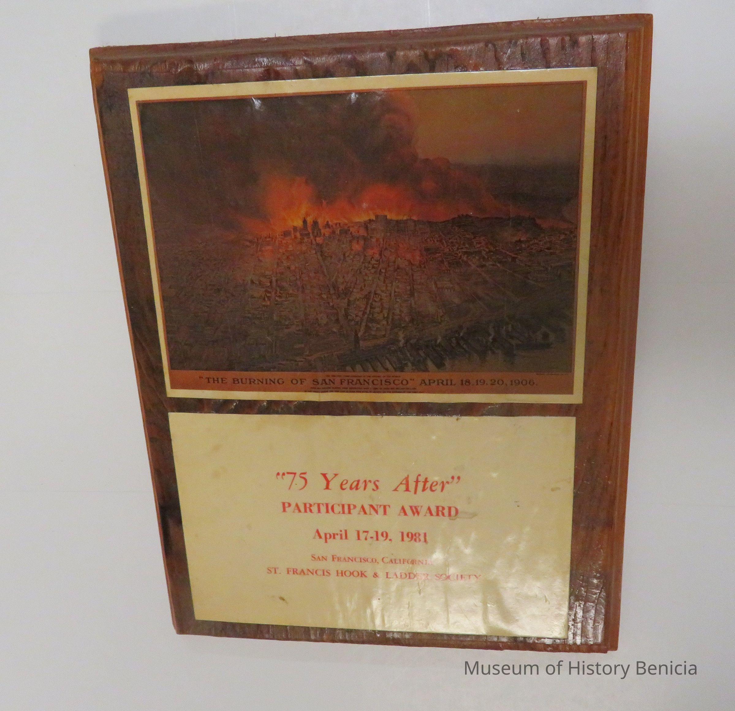 The card below is inscribed with red ink and reads "75 Years After - Participant Award - April 17-19, 1981. San Francisco, California - St. Francis Hook & Ladder Society."Collection
